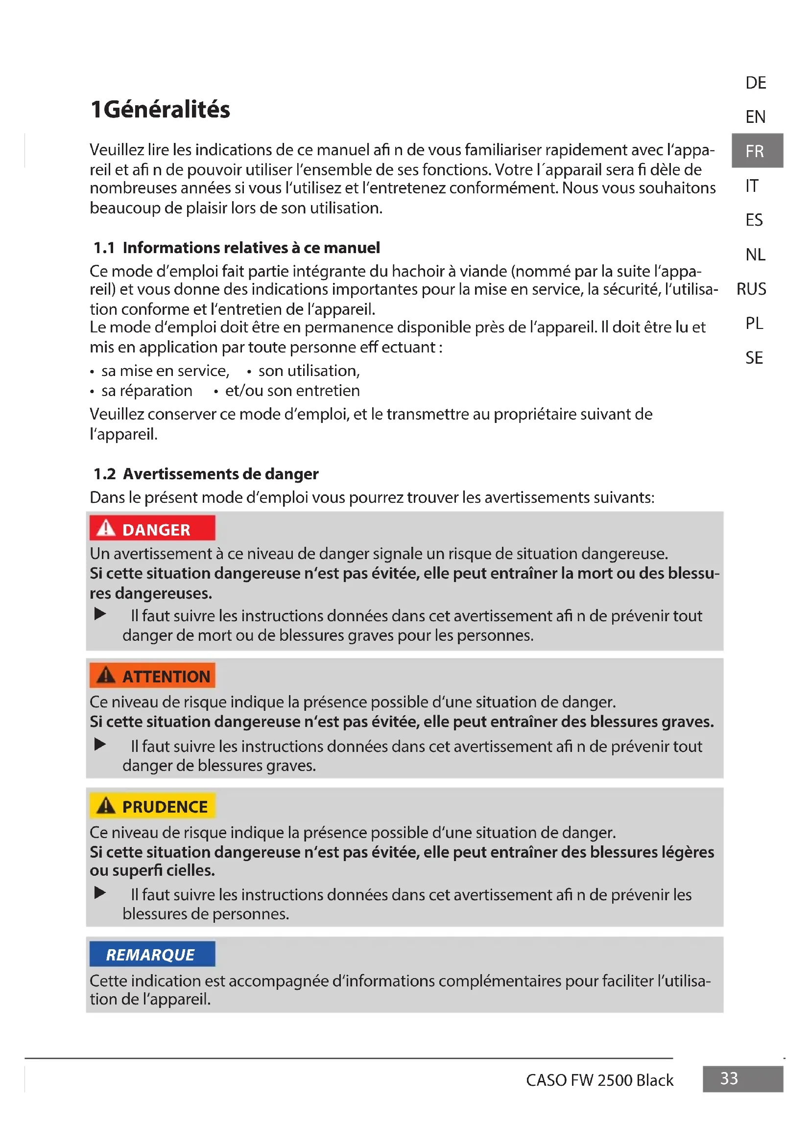 Retrouvez gratuitement la notice de l'appareil FW 2500 CASO au format PDF.