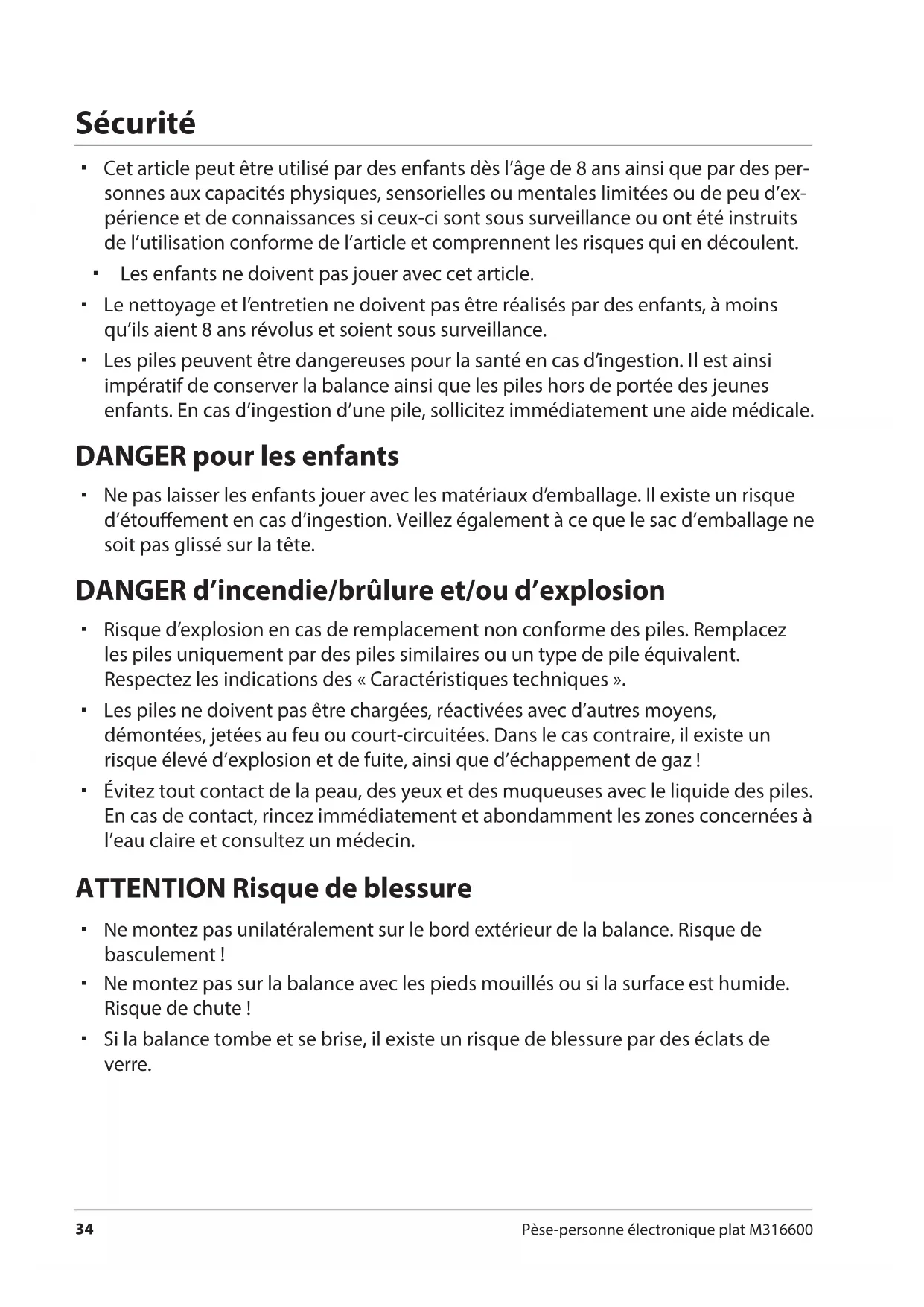 Pèse-personne électronique plat M316600 Sécurité Cet article peut être utilisé par des enfants dès l’âge de 8ans ainsi que par des per- sonnes aux capacités physiques, sensorielles ou mentales limitées ou de peu d’ex- périence et de connaissances si ceux-ci sont sous surveillance ou ont été instruits de l’utilisation conforme de l’article et comprennent les risques qui en découlent. Les enfants ne doivent pas jouer avec cet article. Le nettoyage et l’entretien ne doivent pas être réalisés par des enfants, à moins qu’ils aient 8ans révolus et soient sous surveillance. Les piles peuvent être dangereuses pour la santé en cas d’ingestion. Il est ainsi impératif de conserver la balance ainsi que les piles hors de portée des jeunes enfants. En cas d’ingestion d’une pile, sollicitez immédiatement une aide médicale. DANGER pour les enfants Ne pas laisser les enfants jouer avec les matériaux d’emballage. Il existe un risque d’étouement en cas d’ingestion. Veillez également à ce que le sac d’emballage ne soit pas glissé sur la tête. DANGER d’incendie/brûlure et/ou d’explosion Risque d’explosion en cas de remplacement non conforme des piles. Remplacez les piles uniquement par des piles similaires ou un type de pile équivalent. Respectez les indications des «Caractéristiques techniques». Les piles ne doivent pas être chargées, réactivées avec d’autres moyens, démontées, jetées au feu ou court-circuitées. Dans le cas contraire, il existe un risque élevé d’explosion et de fuite, ainsi que d’échappement de gaz! Évitez tout contact de la peau, des yeux et des muqueuses avec le liquide des piles. En cas de contact, rincez immédiatement et abondamment les zones concernées à l’eau claire et consultez un médecin. ATTENTION Risque de blessure Ne montez pas unilatéralement sur le bord extérieur de la balance. Risque de basculement! Ne montez pas sur la balance avec les pieds mouillés ou si la surface est humide. Risque de chute! Si la balance tombe et se brise, il existe un risque de blessure par des éclats de verre.Utilisation conforme