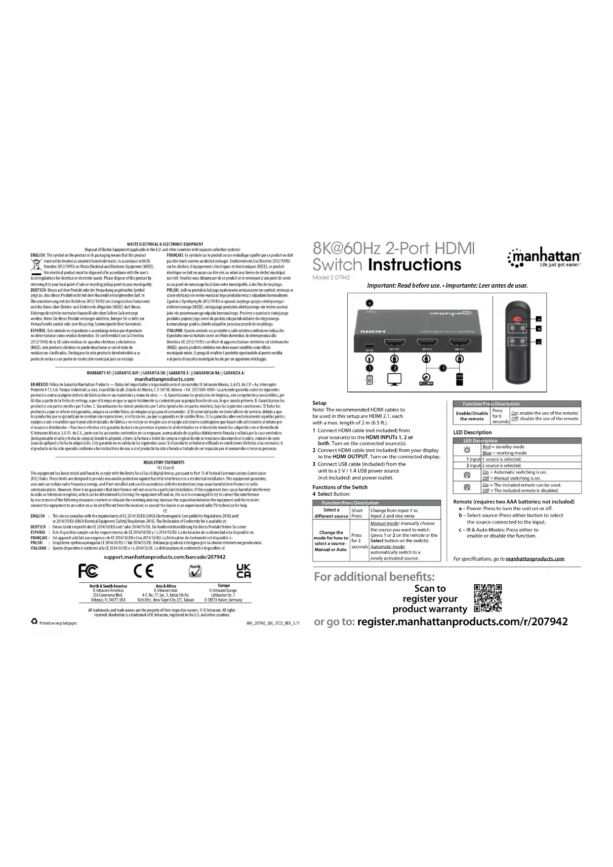 207942 - Commutateur HDMI MANHATTAN - Notice d'utilisation et mode d'emploi gratuit