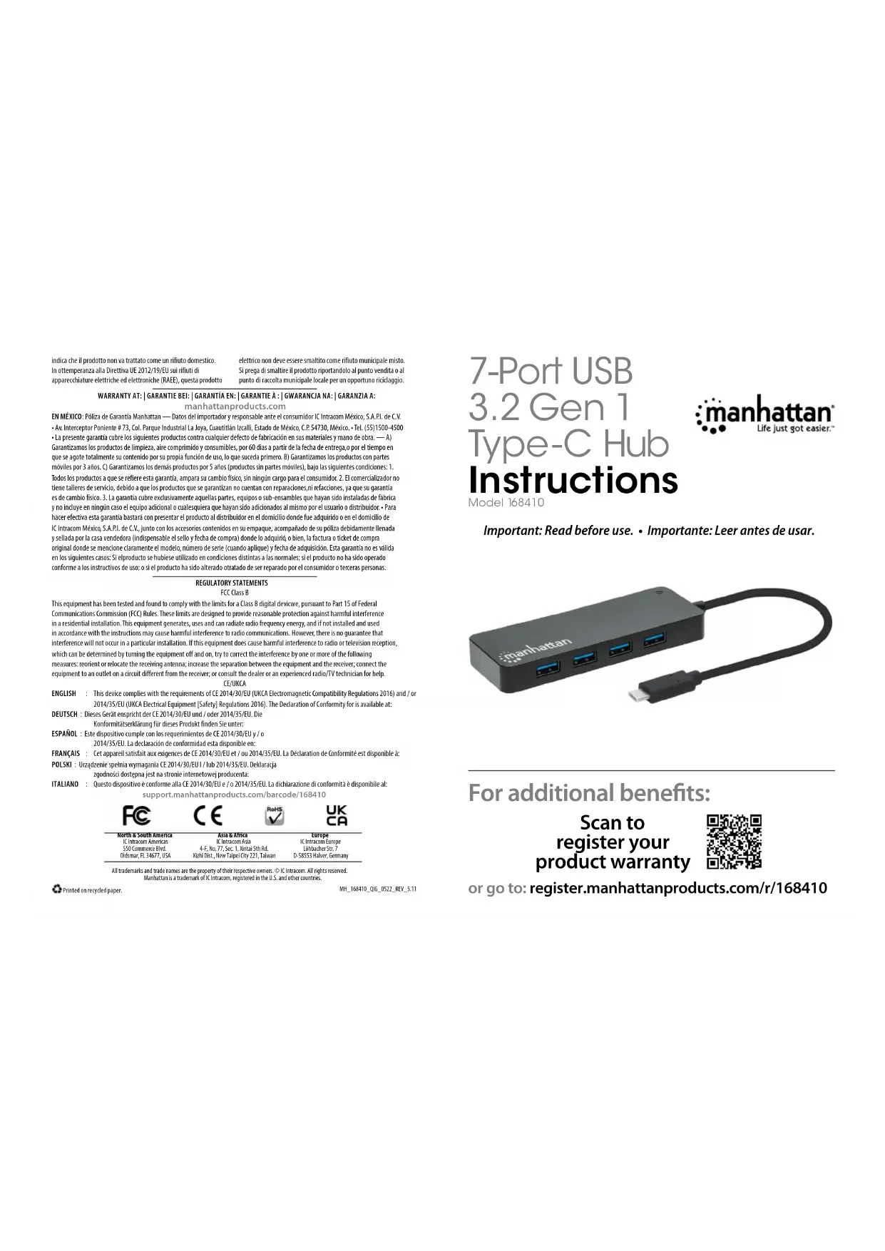 Si nécessaire, utilisez un adaptateur d’alimentation USB (entrée d’alimentation micro USB: 10 W [5,0 V à 2,0 A] máx.). ◊ DEL indicateur d’alimentation Vous trouvez les spécifications sur manhattanproducts.com. Enregistrez votre produit sur register.manhattanproducts.com/r/168410 ou scannez le code QR figurant sur la couverture. POLSKI Funkcja Plug and play zapewnia szybką i łatwą konfigurację – nie wymaga pobierania sterowników.
