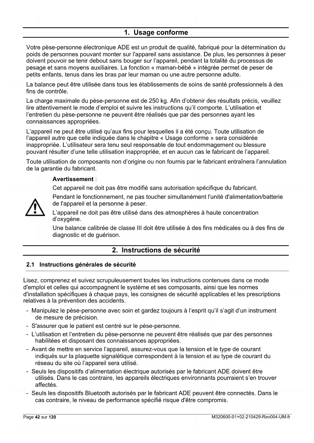 Lisez, comprenez et suivez scrupuleusement toutes les instructions contenues dans ce mode d'emploi et celles qui accompagnent le système et ses composants, ainsi que les normes d'installation spécifiques à chaque pays, les consignes de sécurité applicables et les prescriptions relatives à la prévention des accidents. - Manipulez le pèse-personne avec soin et gardez toujours à l’esprit qu’il s’agit d’un instrument de mesure de précision. - S'assurer que le patient est centré sur le pèse-personne. - L’utilisation et l’entretien du pèse-personne ne peuvent être réalisés que par des personnes habilitées et disposant des connaissances appropriées. - Avant de mettre en service l’appareil, assurez-vous que la tension et le type de courant indiqués sur la plaquette signalétique correspondent à la tension et au type de courant du réseau du site où l’appareil sera utilisé. - Seuls les dispositifs d’alimentation électrique autorisés par le fabricant ADE doivent être utilisés. Dans le cas contraire, les appareils électriques environnants pourraient s’en trouver affectés. - Seuls les dispositifs Bluetooth autorisés par le fabricant ADE peuvent être connectés. Dans le cas contraire, le niveau de performance spécifié risque d'être compromis.M320600-01+02-210429-Rev004-UM-fr Page 43 sur 120 - Toute personne connectant un équipement supplémentaire ou une alimentation électrique (autres que ceux visés à l'article 9) à l'équipement cest responsable que le système est conforme aux exigences de la norme CEI 60601-1. - La fiche mâle/adaptateur isole l'appareil de l'alimentation principale. Ne placez pas l'appareil dans une position où il est difficile de le débrancher du réseau d'alimentation pour mettre fin au fonctionnement de l'appareil en toute sécurité. - Disposez le cordon d’alimentation entre la prise électrique et le pèse-personne de manière à ne présenter aucun danger de trébuchement. - Disposez le cordon d’alimentation entre la prise électrique et le pèse-personne de manière à ne présenter aucun danger d’étranglement. - Ne faites jamais glisser le pèse-personne sur la surface d’installation, car cela pourrait endommager les cellules de pesage. - N’utilisez l’appareil que dans les conditions environnementales autorisées. - N’exposez jamais le pèse-personne à des températures élevées, émises par des appareils à proximité ou par les rayons directs du soleil. L’affichage à cristaux liquides pourrait en être affecté. - Après le stockage dans des conditions extrêmes, au moins 30 min jusqu' à ce que la balance se soit acclimatée et soit prête à l'emploi. - Évitez d’utiliser le pèse-personne dans des courants d’air ou lorsque la température ambiante n’est pas constante, car de telles circonstances pourraient fausser les résultats de mesure. - Essayez, dans la mesure du possible, de placer le pèse-personne à l’écart d’autres appareils et de possibles sources d’interférences, électromagnétiques ou autres, qui pourraient fausser les résultats de mesure. - N’utilisez que des accessoires et périphériques autorisés. - Avant d’entamer le nettoyage de l’appareil, assurez-vous qu’il soit débranché. - N'immergez pas l'appareil dans l'eau ou dans tout autre liquide. - Si le pèse-personne doit rester inutilisé pendant une période prolongée, nettoyez-le et rangez-le en lieu sûr, enveloppé dans un film plastique protecteur. L’ajout d’un sachet desséchant est recommandable. - Retirez les piles de leur compartiment si le pèse-personne doit rester inutilisé pendant une période prolongée. - Si vous rencontrez des problèmes avec cet appareil, tels que la configuration, la maintenance ou l'utilisation, veuillez contacter le service clientèle autorisé. Ne pas ouvrir ou réparer l'appareil par vous-même. - S'il vous plaît, veuillez signaler à l'assistance clientèle autorisée si une opération ou des événements inattendus se produisent. N’utilisez JAMAIS le pèse-personne : - si l’unité d’alimentation est endommagée ; - si l’unité d’alimentation ne fonctionne pas ; - si le compartiment des piles est déformé ; - après un entreposage prolongé dans un environnement humide. Dans de tels cas, veuillez consulter le service après-vente agréé.Page 44 sur 120 M320600-01+02-210429-Rev004-UM-fr