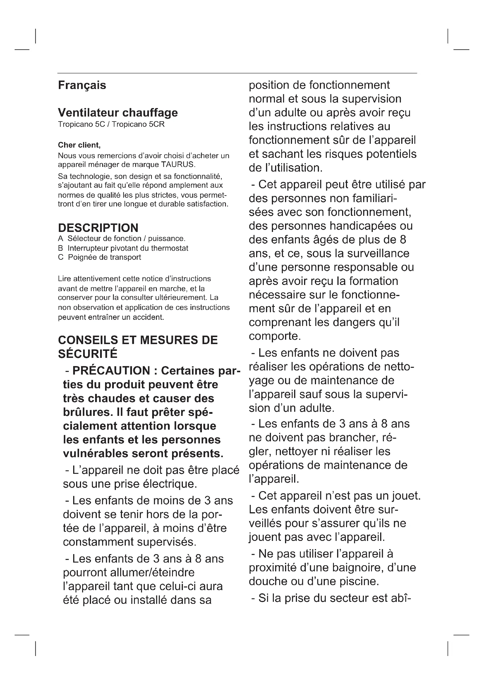 Contact details "ELECTRODOMÉSTICOS TAURUS, S.L. Avda. Barcelona S/N 25790 Oliana, Lleida, Spain”Français Ventilateur chauffage Tropicano 5C / Tropicano 5CR Cher client, Nous vous remercions d’avoir choisi d’acheter un appareil ménager de marque TAURUS. Sa technologie, son design et sa fonctionnalité, s’ajoutant au fait qu’elle répond amplement aux normes de qualité les plus strictes, vous permet- tront d’en tirer une longue et durable satisfaction. DESCRIPTION A Sélecteur de fonction / puissance. B Interrupteur pivotant du thermostat C Poignée de transport Lire attentivement cette notice d’instructions avant de mettre l’appareil en marche, et la conserver pour la consulter ultérieurement. La non observation et application de ces instructions peuvent entraîner un accident.