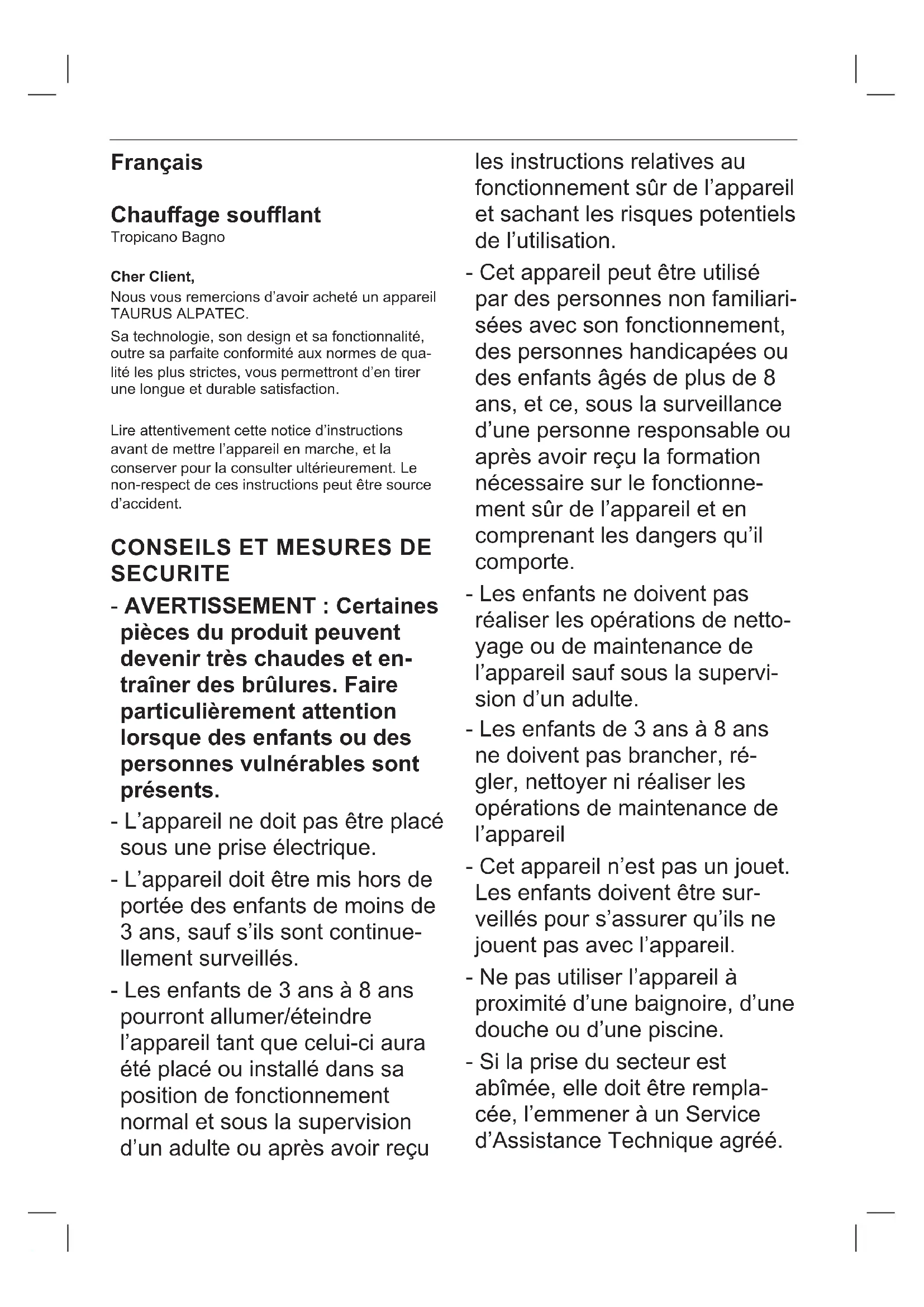 Contact details "ELECTRODOMÉSTI- COS TAURUS, S.L. Avda. Barcelona S/N 25790 Oliana, Lleida, Spain”Français Chauage souant Tropicano Bagno Cher Client, Nous vous remercions d’avoir acheté un appareil TAURUS ALPATEC. Sa technologie, son design et sa fonctionnalité, outre sa parfaite conformité aux normes de qua- lité les plus strictes, vous permettront d’en tirer une longue et durable satisfaction. Lire attentivement cette notice d’instructions avant de mettre l’appareil en marche, et la conserver pour la consulter ultérieurement. Le non-respect de ces instructions peut être source d’accident.