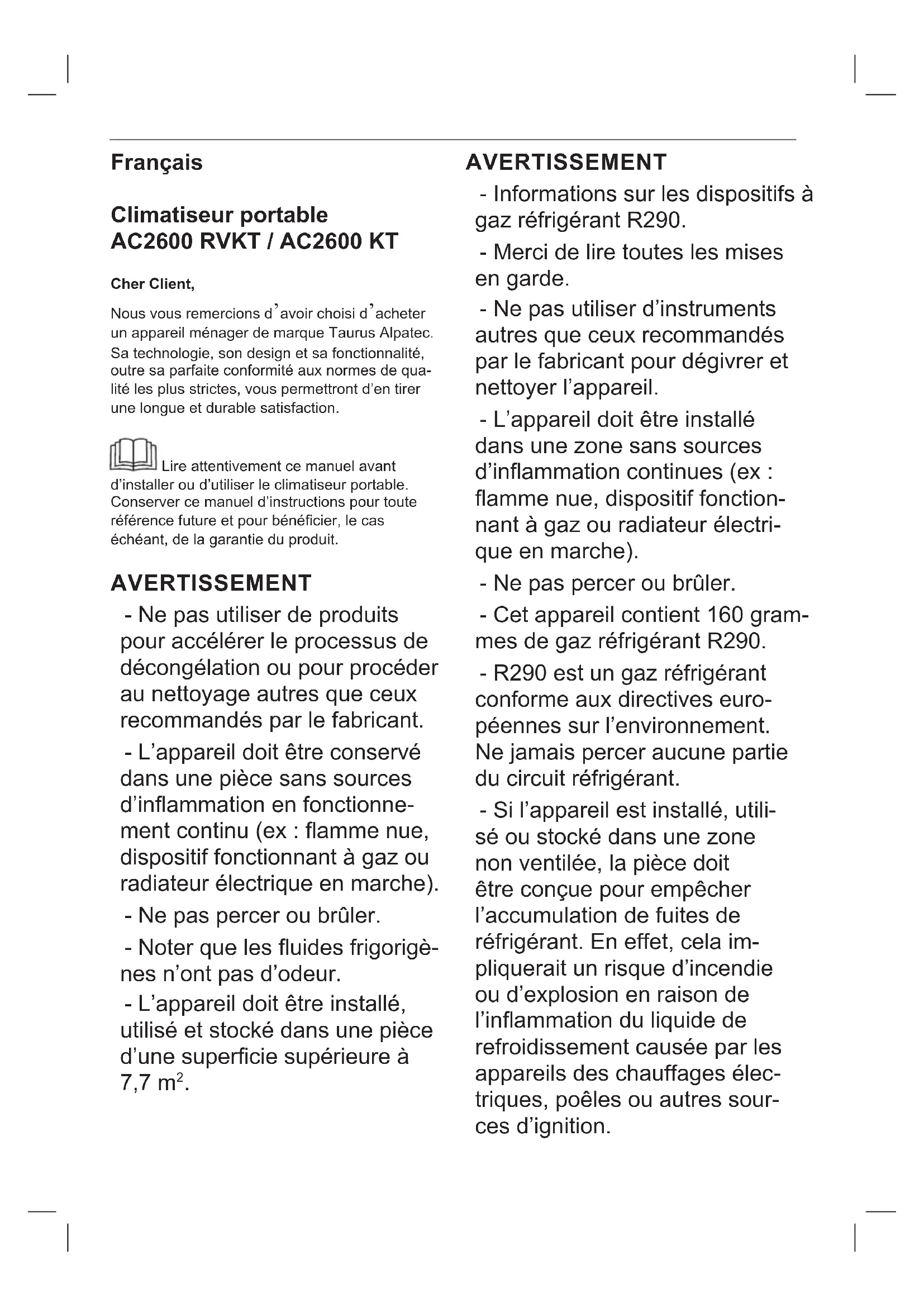 Cher Client, Nous vous remercions d’avoir choisi d’acheter un appareil ménager de marque Taurus Alpatec. Sa technologie, son design et sa fonctionnalité, outre sa parfaite conformité aux normes de qua- lité les plus strictes, vous permettront d’en tirer une longue et durable satisfaction. Lire attentivement ce manuel avant d’installer ou d’utiliser le climatiseur portable. Conserver ce manuel d’instructions pour toute référence future et pour bénécier, le cas échéant, de la garantie du produit. AVERTISSEMENT - Ne pas utiliser de produits pour accélérer le processus de décongélation ou pour procéder au nettoyage autres que ceux recommandés par le fabricant. - L’appareil doit être conservé dans une pièce sans sources d’inammation en fonctionne- ment continu (ex : amme nue, dispositif fonctionnant à gaz ou radiateur électrique en marche). - Ne pas percer ou brûler. - Noter que les uides frigorigè- nes n’ont pas d’odeur. - L’appareil doit être installé, utilisé et stocké dans une pièce d’une supercie supérieure à 7,7 m