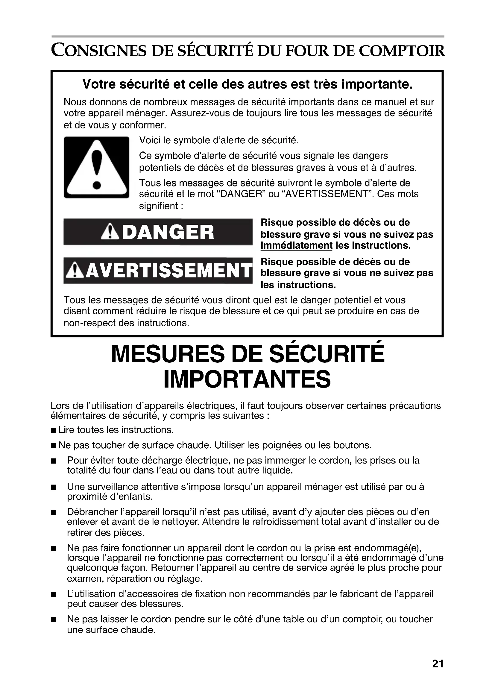 Lire toutes les instructions. Ne pas toucher de surface chaude. Utiliser les poignées ou les boutons. Pour éviter toute décharge électrique, ne pas immerger le cordon, les prises ou la totalité du four dans l'eau ou dans tout autre liquide. Une surveillance attentive s'impose lorsqu'un appareil ménager est utilisé par ou à proximité d'enfants. - Débrancher l'appareil lorsqu'il n'est pas utilisé, avant d'y ajouter des pièces ou d'enlever et avant de le nettoyer. Attendre le refroidissement total avant d'installer ou de retirer des pièces. Ne pas faire fonctionner un appareil dont le cordon ou la prise est endommagé(e), lorsque l'appareil ne fonctionne pas correctement ou lorsqu'il a été endommagé d'une quelconque façon. Retourner l'appareil au centre de service agréé le plus proche pour examen, réparation ou réglage. L'utilisation d'accessoires de fixation non recommandés par le fabricant de l'appareil peut causer des blessures. Ne pas laisser le cordon pendre sur le côté d'une table ou d'un comptoir, ou toucher une surface chaude.