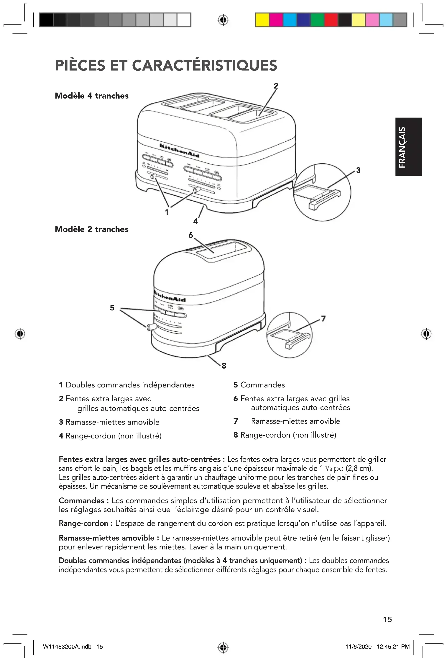 po (2,8cm). Les grilles auto-centrées aident à garantir un chauffage uniforme pour les tranches de pain fines ou épaisses. Un mécanisme de soulèvement automatique soulève et abaisse les grilles. Commandes: Les commandes simples d’utilisation permettent à l’utilisateur de sélectionner les réglages souhaités ainsi que l’éclairage désiré pour un contrôle visuel. Range-cordon: L’espace de rangement du cordon est pratique lorsqu’on n’utilise pas l’appareil. Ramasse-miettes amovible: Le ramasse-miettes amovible peut être retiré (en le faisant glisser) pour enlever rapidement les miettes. Laver à la main uniquement. Doubles commandes indépendantes (modèles à 4 tranches uniquement): Les doubles commandes indépendantes vous permettent de sélectionner différents réglages pour chaque ensemble de fentes.
