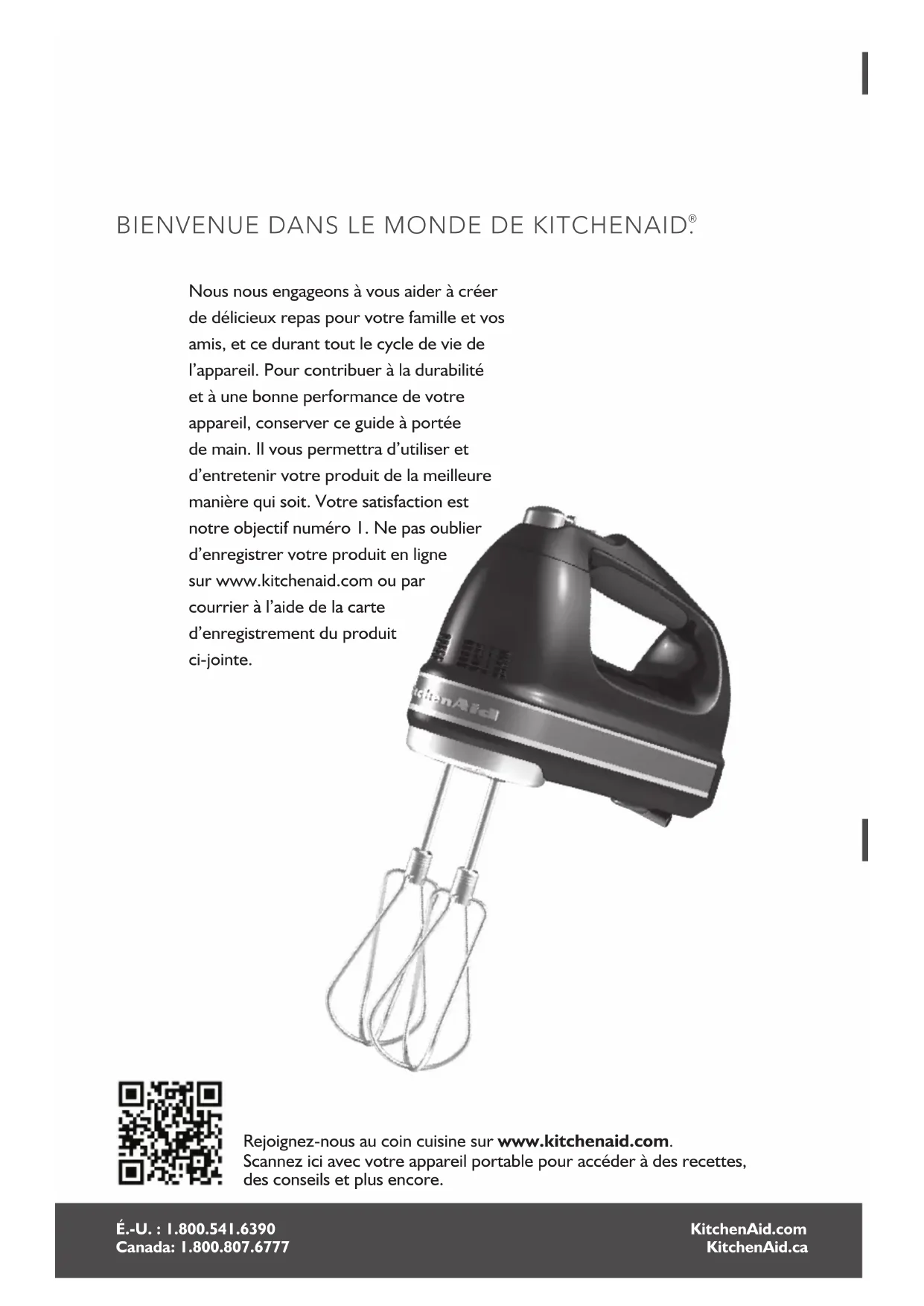 Nous nous engageons à vous aider à créer de délicieux repas pour votre famille et vos amis, et ce durant tout le cycle de vie de l’appareil. Pour contribuer à la durabilité et à une bonne performance de votre appareil, conserver ce guide à portée de main. Il vous permettra d’utiliser et d’entretenir votre produit de la meilleure manière qui soit. Votre satisfaction est notre objectif numéro 1. Ne pas oublier d’enregistrer votre produit en ligne sur www.kitchenaid.com ou par courrier à l’aide de la carte d’enregistrement du produit ci-jointe. KitchenAid.com KitchenAid.ca Rejoignez-nous au coin cuisine sur www.kitchenaid.com. Scannez ici avec votre appareil portable pour accéder à des recettes, des conseils et plus encore.