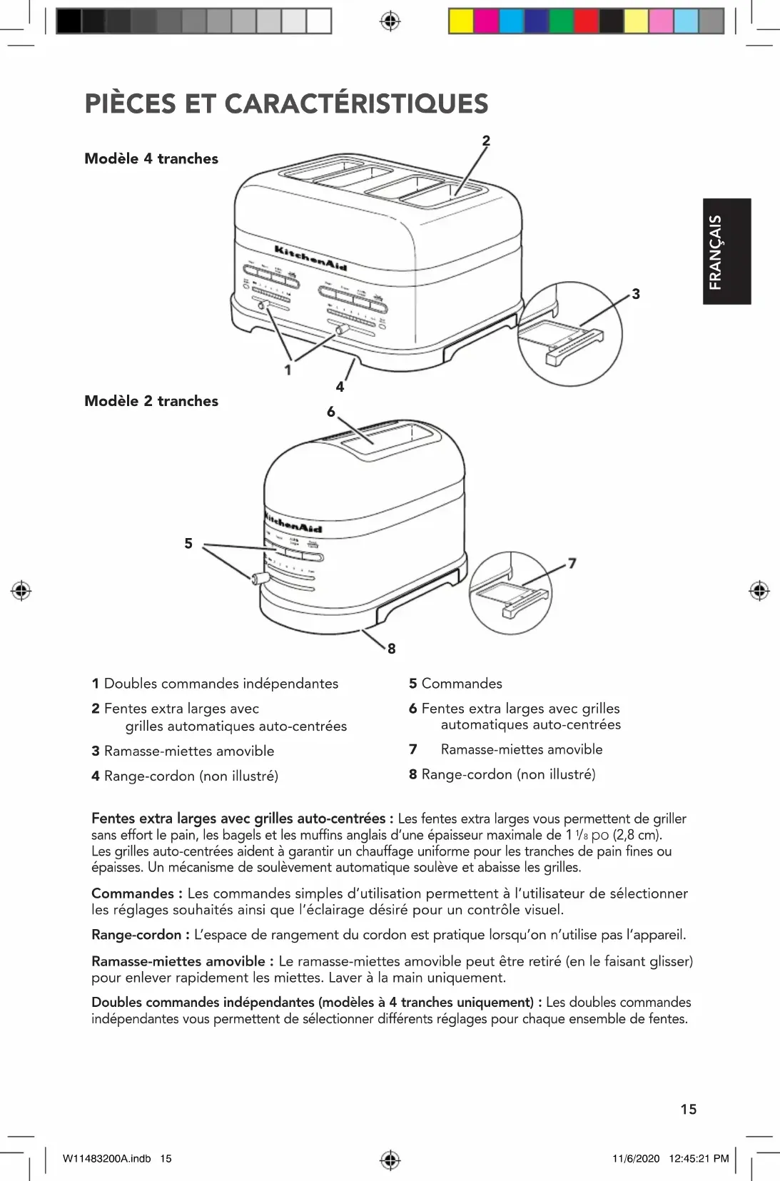 po (2,8cm). Les grilles auto-centrées aident à garantir un chauffage uniforme pour les tranches de pain fines ou épaisses. Un mécanisme de soulèvement automatique soulève et abaisse les grilles. Commandes: Les commandes simples d’utilisation permettent à l’utilisateur de sélectionner les réglages souhaités ainsi que l’éclairage désiré pour un contrôle visuel. Range-cordon: L’espace de rangement du cordon est pratique lorsqu’on n’utilise pas l’appareil. Ramasse-miettes amovible: Le ramasse-miettes amovible peut être retiré (en le faisant glisser) pour enlever rapidement les miettes. Laver à la main uniquement. Doubles commandes indépendantes (modèles à 4 tranches uniquement): Les doubles commandes indépendantes vous permettent de sélectionner différents réglages pour chaque ensemble de fentes.