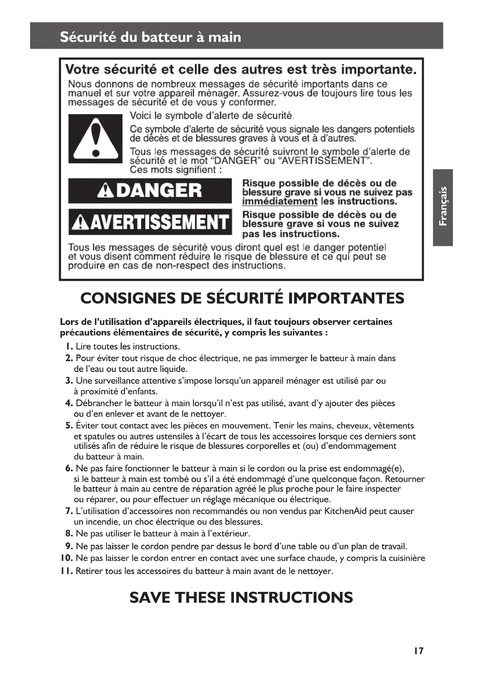 Sécurité du batteur à main W10434746A-EFS.indd 17 3/22/12 5:15 PM18 Volts : 120 CA uniquement. Hertz : 60 Hz REMARQUE : Ce batteur à main comporte une fiche polarisée (avec une lame plus large que l’autre). Pour réduire le risque de choc électrique, cette fiche ne peut être insérée dans une prise polarisée que dans un seul sens. Si la fiche ne s’enfonce pas complètement dans la prise, inverser la fiche. Si la fiche ne s’introduit toujours pas, appeler un électricien qualifié. Ne pas modifier la prise de quelque manière que ce soit. Ce produit est conçu uniquement pour un usage domestique. Sécurité du batteur à main Spécications électriques Preuve d’achat et enregistrement du produit Veuillez toujours conserver une copie du reçu de caisse indiquant la date d’achat du batteur à main. La preuve d’achat vous garantit le bénéce du service après-vente. Avant d’utiliser le batteur à main, remplir et poster la carte d’enregistrement du produit fournie avec l’appareil. Grâce à cette carte, nous pourrons vous contacter dans l’éventualité improbable d’un avis de sécurité concernant le produit; ceci nous aidera aussi à nous conformer aux dispositions de la Loi sur la sécurité des produits de consommation. Cette carte ne conrme pas votre garantie. Veuillez remplir ce qui suit pour vos dossiers personnels : Numéro de modèle ___________________________________________________ Numéro de série ______________________________________________________ Date d’achat _________________________________________________________ Nom et adresse du magasin ____________________________________________ W10434746A-EFS.indd 18 3/22/12 5:15 PM19 Français Pièces et caractéristiques Support arrière anti-basculement Accessoire Turbo Beater™ en acier inoxydable Cordon d’alimentation pivotant et blocable Poignée confortable Large bouton éjecteur de batteur Commande de vitesse facile d’utilisation Évents Fouet en acier inoxydable à 12 tiges (fourni avec les modèles à 6 vitesses) W10434746A-EFS.indd 19 3/22/12 5:15 PM20 Pièces et caractéristiques Moteur CC puissant Il permet un mélange puissant et est conçu pour fonctionner durablement et en silence. Commande de vitesse facile d’utilisation Émet un déclic de conrmation à chaque changement de vitesse. Poignée confortable La poignée inclinée soulage le bras; sa structure arrondie offre une prise confortable pour des mains de toutes tailles. Design facile à nettoyer La structure lisse de l’appareil ne comporte aucune rainure susceptible de retenir des aliments. Facilite le nettoyage. Large bouton éjecteur de batteur Permet l’éjection facile des batteurs, et ce d’une seule main. Cordon d’alimentation pivotant et blocable Le design arrondi permet d’éviter que les ingrédients s’incrustent sur l’appareil. Facilite le nettoyage. Bloquer le cordon d’alimentation en position en le faisant pivoter vers la gauche ou la droite pour faciliter le mélange, quelle que soit l’inclinaison de la main. Les pièces et accessoires importants fournis avec votre nouveau batteur à main sont décrits ci-dessous. Consulter les pages suivantes pour de plus amples renseignements sur les accessoires fournis avec le batteur à main. Support arrière anti-basculement Maintient le batteur en place lorsqu’il n’est pas utilisé. Évents Positionnés de façon à empêcher toute obstruction par des morceaux de pâte ou autres préparations. Turbo Beater™ Le design métallique arrondi de l’accessoire Turbo Beater empêche toute agglomération et permet de mélanger uniformément les ingrédients plutôt que de les écraser, tout en faisant du nettoyage un jeu d’enfants. Acier inoxydable de haute qualité, lavable au lave-vaisselle. Fouet à 12 tiges L’acier inoxydable de haute qualité est conçu pour donner une consistance plus aérée à la crème fouettée et aux œufs en neige. Fourni avec les modèles à 6 vitesses. Qualité de marque Kitchenaid Votre batteur à main est connu et testé pour répondre aux normes KitchenAid pour une performance et une durabilité optimales. Nous sommes tellement certains que la qualité de nos produits satisfait aux normes rigoureuses de KitchenAid que si le batteur à main cesse de fonctionner au cours de la première année suivant son acquisition, KitchenAid prendra les dispositions nécessaires pour vous livrer un appareil de remplacement identique ou comparable. W10434746A-EFS.indd 20 3/22/12 5:15 PM21 Français Accessoires Turbo Beater™ Pour commander ces accessoires Aux É.-U. : visiter www.shopkitchenaid.com, ou composer le 1-800-541-6390 Au Canada : composer le 1-800-807-6777