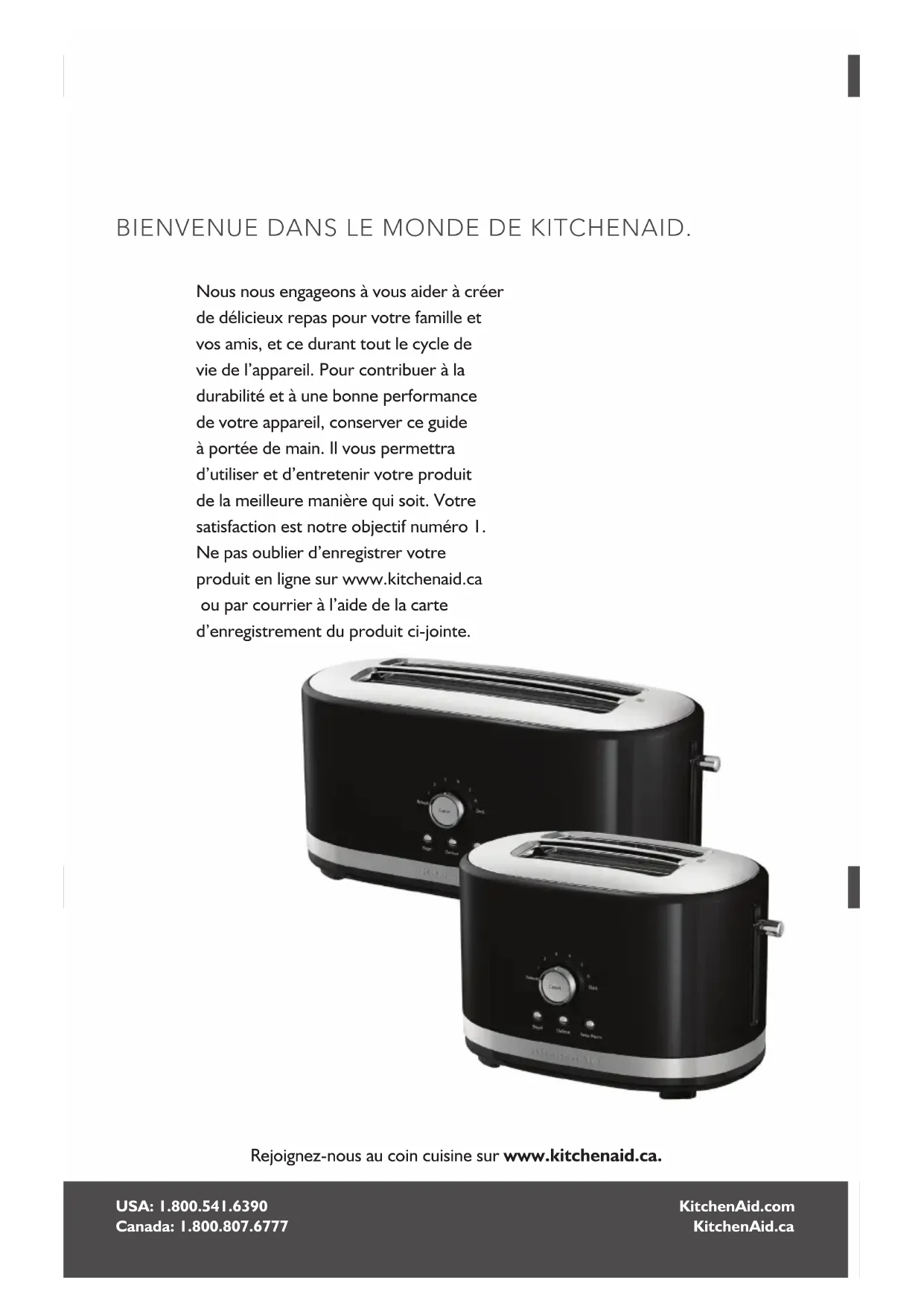 CMD + SHIFT CLICK TO CHANGE COPYGARANTIE ET DÉPANNAGE Aux États-Unis et à Porto Rico : our des informations sur le service de dépannage ou pour commander des accessoires ou des pièces de rechange, composer le numéro sans frais 1-800-541-6390 ou écrire à : Customer eXperience Center, KitchenAid Small Appliances, P.O. Box 218, St. Joseph, MI 49085-0218 En dehors des États-Unis et de Porto Rico : Consulter le revendeur KitchenAid local ou le détaillant auprès duquel Du Grille-Pain a été acheté pour connaître la marche à suivre en cas d’intervention de dépannage nécessaire. Pour des informations concernant toute intervention de dépannage au Canada: 1-800-807-6777. Pour des informations concernant toute intervention de dépannage au Mexique: 01-800-0022-767. Nous sommes tellement certains que la qualité de nos produits satisfait aux normes exigeantes de KitchenAid que si la Du Grille-Pain cesse de fonctionner au cours de la première année suivant son acquisition, KitchenAid livrera gratuitement à votre porte un appareil de remplacement identique ou comparable et prendra les dispositions nécessaires pour que la Du Grille-Pain d’origine nous soit retourné. L’appareil de remplacement sera également couvert par notre garantie limitée d’un an. Si la Du Grille-Pain cesse de fonctionner durant la première année suivant son acquisition, il vous suft d’appeler notre Centre d’eXpérience à la clientèle au 1-800-541-6390, du lundi au vendredi. Veuillez avoir votre reçu de vente à portée de main au moment de votre appel. Une preuve d’achat est indispensable pour que votre réclamation puisse être traitée. Fournissez votre adresse de livraison complète au représentant. (Pas de boîte postale) Après avoir reçu la Du Grille-Pain de rechange, utiliser le carton, les matériaux d’emballage et l’étiquette d’expédition prépayée pour emballer la Du Grille-Pain d’origine et la renvoyer à KitchenAid. Nous sommes tellement certains que la qualité de nos produits satisfait aux normes exigeantes de la marque KitchenAid que si la Du Grille-Pain cesse de fonctionner au cours de la première année suivant son acquisition, KitchenAid Canada remplacera la Du Grille-Pain par un appareil de remplacement identique ou comparable. L’appareil de remplacement sera également couvert par notre garantie limitée d’un an. Si la Du Grille-Pain cesse de fonctionner durant la première année suivant son acquisition, il vous suft d’appeler notre Centre d’eXpérience à la clientèle au 1-800-807-6777, du lundi au vendredi. Veuillez avoir votre reçu de vente à portée de main au moment de votre appel. Une preuve d’achat est indispensable pour que votre réclamation puisse être traitée. Fournissez votre adresse de livraison complète au représentant. Après avoir reçu la Du Grille-Pain de rechange, utiliser le carton, les matériaux d’emballage et l’étiquette d’expédition prépayée pour emballer la Du Grille-Pain d’origine et la renvoyer à KitchenAid. Garantie de remplacement sans difculté – Canada Obtenir un dépannage une fois la garantie expirée ou commander des accessoires et pièces de rechange Garantie de remplacement sans difculté – 50 États des États-Unis, district fédéral de Columbia et Porto Rico W10739208A_FR_v03.indd 30 2/23/15 2:19 PM31 Español USA: 1.800.541.6390 Canada: 1.800.807.6777 BIENVENIDO AL MUNDO DE KITCHENAID. Únase a nosotros en la cocina, visite www.kitchenaid.com. KitchenAid.com KitchenAid.ca Estamos comprometidos a ayudarle a crear deliciosas comidas para su familia y amistades por toda la vida. Para ayudar a asegurar la larga duración y el desempeño de su aparato, mantenga esta guía a la mano. Ésta le proveerá información sobre la mejor manera de usar y cuidar su producto. Su satisfacción es nuestra meta número 1. Recuerde registrar su producto en línea en www.kitchenaid.com, o bien por correo usando la Tarjeta de registro del producto adjunta. W10739208A_SP_v03.indd 31 2/23/15 2:19 PMCMD + SHIFT CLICK TO CHANGE COPY