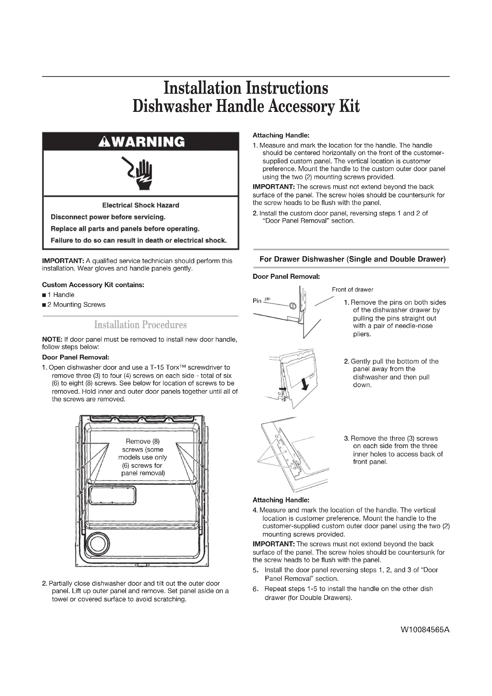 panel away from the dishwasher and then pull down.Instructions d’installation Ensemble pour poignée de lave-vaisselle (accessoire) W10084565A IMPORTANT: L’installation doit être exécutée par un technicien qualifié. Porter des gants et manipuler les panneaux prudemment. L'ensemble personnalisé (accessoire) comprend : ■ 1 poignée■ 2 vis de montage Méthode d”installation REMARQUE : S’il est nécessaire d’enlever le panneau de porte pour l’installation de la nouvelle poignée, procéder comme suit. Dépose du panneau de porte :
