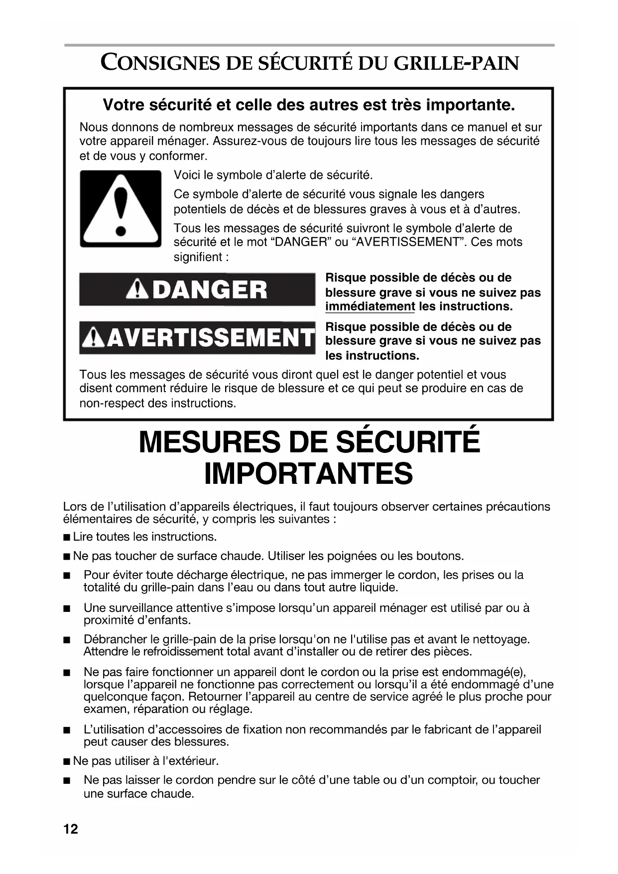 IMPORTANTES Lors de l’utilisation d’appareils électriques, il faut toujours observer certaines précautions élémentaires de sécurité, y compris les suivantes :■ Lire toutes les instructions.■ Ne pas toucher de surface chaude. Utiliser les poignées ou les boutons. ■ Pour éviter toute décharge électrique, ne pas immerger le cordon, les prises ou la totalité du grille-pain dans l’eau ou dans tout autre liquide. ■ Une surveillance attentive s’impose lorsqu’un appareil ménager est utilisé par ou à proximité d’enfants. ■ Débrancher le grille-pain de la prise lorsqu'on ne l'utilise pas et avant le nettoyage. Attendre le refroidissement total avant d’installer ou de retirer des pièces. ■ Ne pas faire fonctionner un appareil dont le cordon ou la prise est endommagé(e), lorsque l’appareil ne fonctionne pas correctement ou lorsqu’il a été endommagé d’une quelconque façon. Retourner l’appareil au centre de service agréé le plus proche pour examen, réparation ou réglage. ■ L’utilisation d’accessoires de fixation non recommandés par le fabricant de l’appareil peut causer des blessures.■ Ne pas utiliser à l'extérieur. ■ Ne pas laisser le cordon pendre sur le côté d’une table ou d’un comptoir, ou toucher une surface chaude.Risque possible de décès ou de blessure grave si vous ne suivez pas immédiatement les instructions. Risque possible de décès ou de blessure grave si vous ne suivez pas les instructions. Tous les messages de sécurité vous diront quel est le danger potentiel et vous disent comment réduire le risque de blessure et ce qui peut se produire en cas de non-respect des instructions. Votre sécurité et celle des autres est très importante. Nous donnons de nombreux messages de sécurité importants dans ce manuel et sur votre appareil ménager. Assurez-vous de toujours lire tous les messages de sécurité et de vous y conformer. DANGER Voici le symbole d’alerte de sécurité.Ce symbole d’alerte de sécurité vous signale les dangers potentiels de décès et de blessures graves à vous et à d’autres.Tous les messages de sécurité suivront le symbole d’alerte de sécurité et le mot “DANGER” ou “AVERTISSEMENT”. Ces mots signifient : AVERTISSEMENT13 ■ Ne pas placer sur ou près d’un brûleur électrique ou à gaz chaud, ou dans un four chaud. ■ Pour déconnecter, tourner toutes les commandes à “OFF”, puis débrancher la fiche de la prise. ■ Ne pas utiliser l'appareil pour un autre usage que celui auquel il est destiné. ■ On ne doit insérer ni aliments surdimensionnés, ni emballages en aluminium ou ustensiles dans le grille-pain car ils peuvent présenter un risque d'incendie ou de décharge électrique. ■ Lorsque le grille-pain est en cours de fonctionnement, un incendie peut se produire si le grille-pain est recouvert par un matériau inflammable ou en contact avec celui-ci, notamment des rideaux, draperies, parois et autres objets assimilés. ■ Ne pas essayer de déloger les aliments lorsque le grille-pain est branché. ■ Ce produit est conçu uniquement pour un usage domestique.