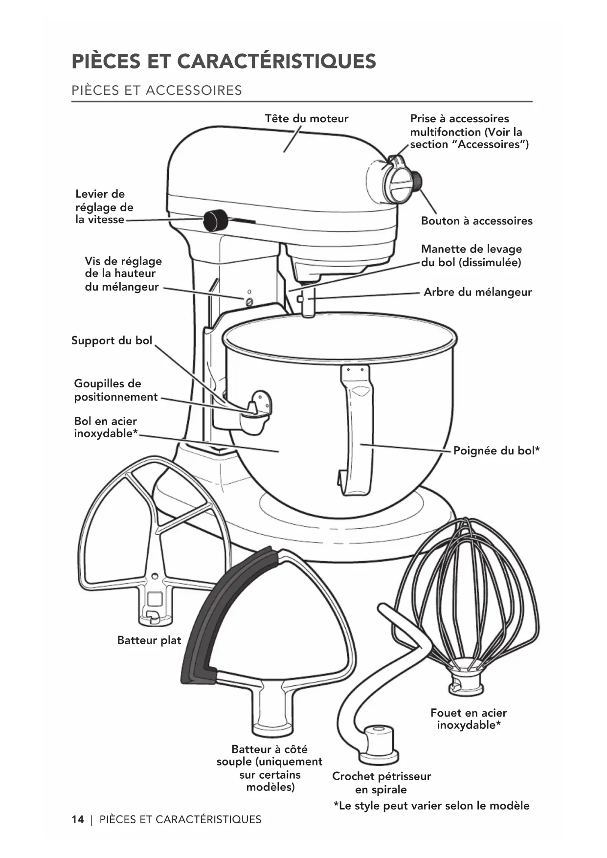 Tête du moteur Prise à accessoires multifonction (Voir la section “Accessoires”) Bouton à accessoires Levier de réglage de la vitesse Vis de réglage de la hauteur du mélangeur Support du bol Goupilles de positionnement Batteur plat Crochet pétrisseur en spirale Fouet en acier inoxydable* Bol en acier inoxydable* Manette de levage du bol (dissimulée) Poignée du bol* Arbre du mélangeur Batteur à côté souple (uniquement sur certains modèles) *Le style peut varier selon le modèle W10862776A_FR_v04.indd 14 2/24/2016 3:36:22 PMSÉCURITÉ DU MÉLANGEUR SUR SOCLE | 15 FRANÇAIS SÉCURITÉ DU MÉLANGEUR SUR SOCLE