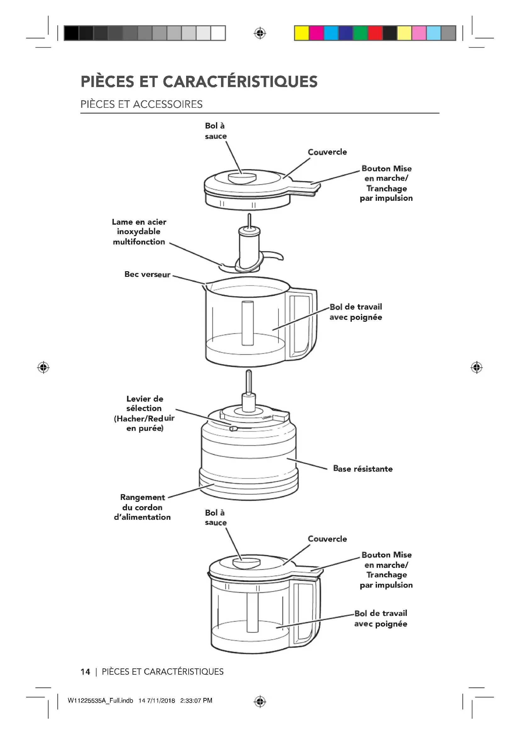 Couvercle Couvercle Bol de travail avec poignée Bol de travail avec poignée Rangement du cordon d’alimentation Lame en acier inoxydable multifonction Base résistante Levier de sélection (Hacher/Reduir en purée) Bol à sauce Bol à sauce BoutonMise en marche/ Tranchage par impulsion BoutonMise en marche/ Tranchage par impulsion Bec verseur W11225535A_Full.indb 14 7/11/2018 2:33:07 PMSÉCURITÉ DU HACHOIR | 15 FRANÇAIS