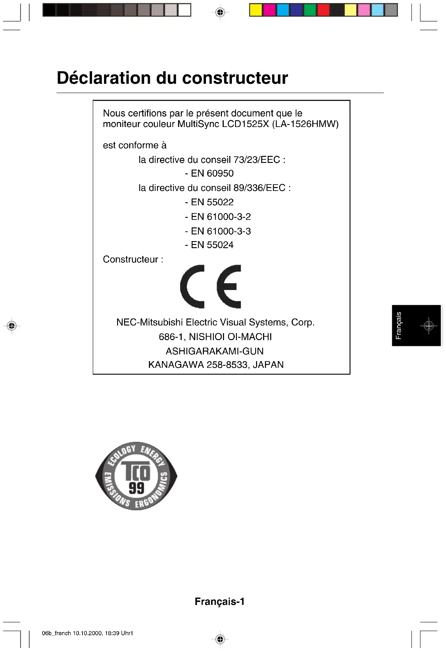 06b_french 10.10.2000, 18:39 Uhr1Français-2 Contenu L’emballage de votre nouveau moniteur MultiSync LCD NEC-Mitsubishi doit contenir les éléments suivants : – NEC MultiSync LCD1525X. – Cordon d’alimentation – Câble DVI-A vers VGA. – Câble signal vidéo DVI-D vers DVI-D. – Câble USB. – CD-ROM comprenant le manuel de l’utilisateur complet au format PDF et les fichiers Windows associés (fichier .inf et profil de couleurs). Acrobat Reader 4.0 doit avoir été installé sur votre PC pour pouvoir visualiser l’ensemble du manuel de l’utilisateur. – Manuel de l’utilisateur N’oubliez pas de conserver l’emballage d’origine pour transporter ou expédier le moniteur.
