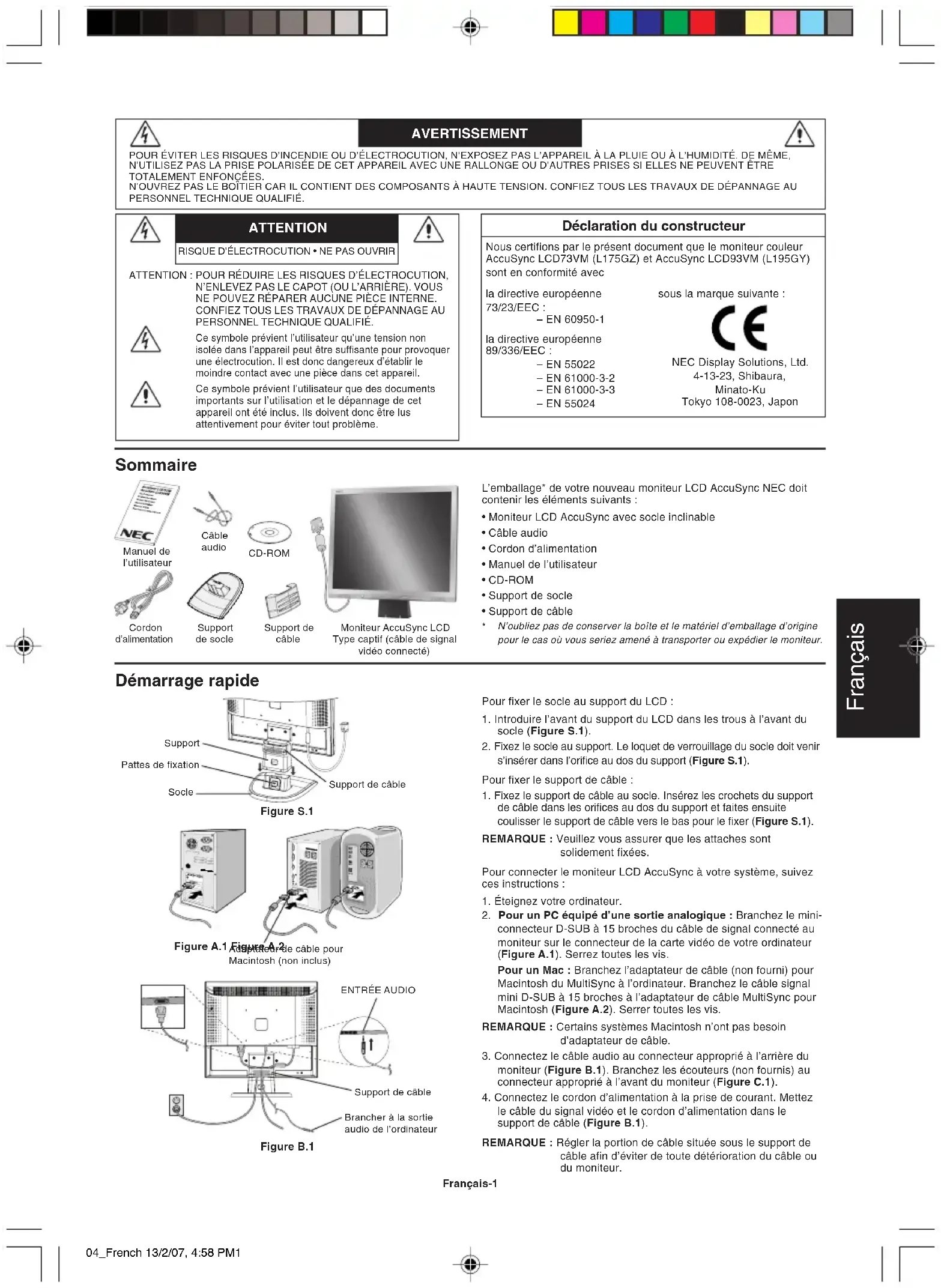 le câble du signal vidéo et le cordon d’alimentation dans le support de câble (Figure B.1). REMARQUE : Régler la portion de câble située sous le support de câble afin d’éviter de toute détérioration du câble ou du moniteur. Déclaration du constructeur Nous certifions par le présent document que le moniteur couleur AccuSync LCD73VM (L175GZ) et AccuSync LCD93VM (L195GY) sont en conformité avec sous la marque suivante : NEC Display Solutions, Ltd. 4-13-23, Shibaura, Minato-Ku Tokyo 108-0023, Japon la directive européenne 73/23/EEC : – EN 60950-1 la directive européenne 89/336/EEC : – EN 55022 – EN 61000-3-2 – EN 61000-3-3 – EN 55024 Figure S.1 SoclePattes de fixationSupport Figure A.1 Figure A.2 Adaptateur de câble pourMacintosh (non inclus)Support de câbleENTRÉE AUDIOBrancher à la sortieaudio de l’ordinateur Figure B.1 Support de câbleManuel del’utilisateurCordond’alimentationCâbleaudioSupportde socleSupport decâbleMoniteur AccuSync LCDType captif (câble de signalvidéo connecté)CD-ROM 04_French 13/2/07, 4:58 PM1Français Français-2 Commandes Fonctionnement des boutons de commandes OSM (On-screen Manager – Gestionnaire à l’écran) sur la face avant du moniteur :