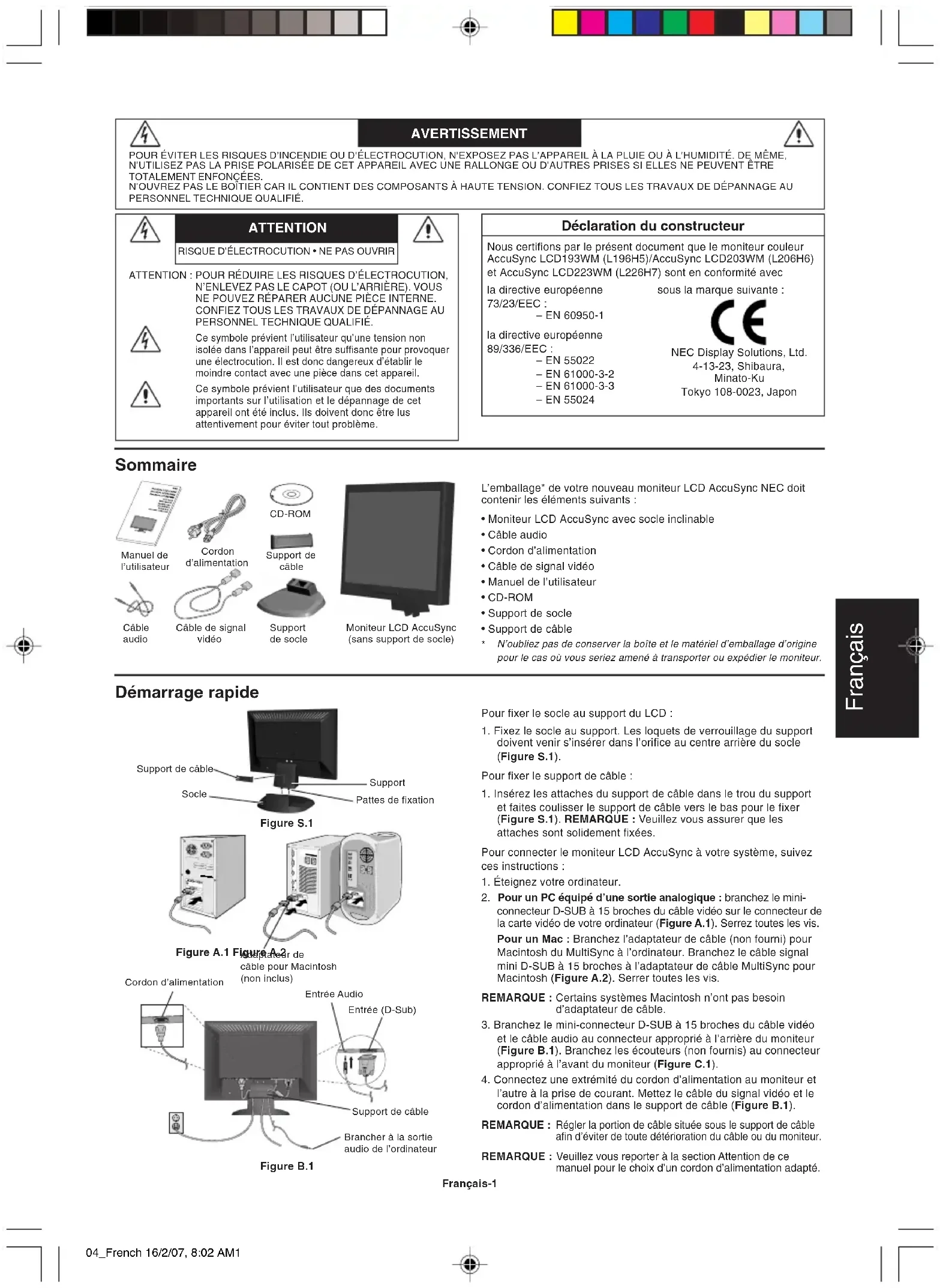 Nous certifions par le présent document que le moniteur couleur AccuSync LCD193WM (L196H)/AccuSync LCD203WM (L206H) et AccuSync LCD223WM (L226H) sont en conformité avec