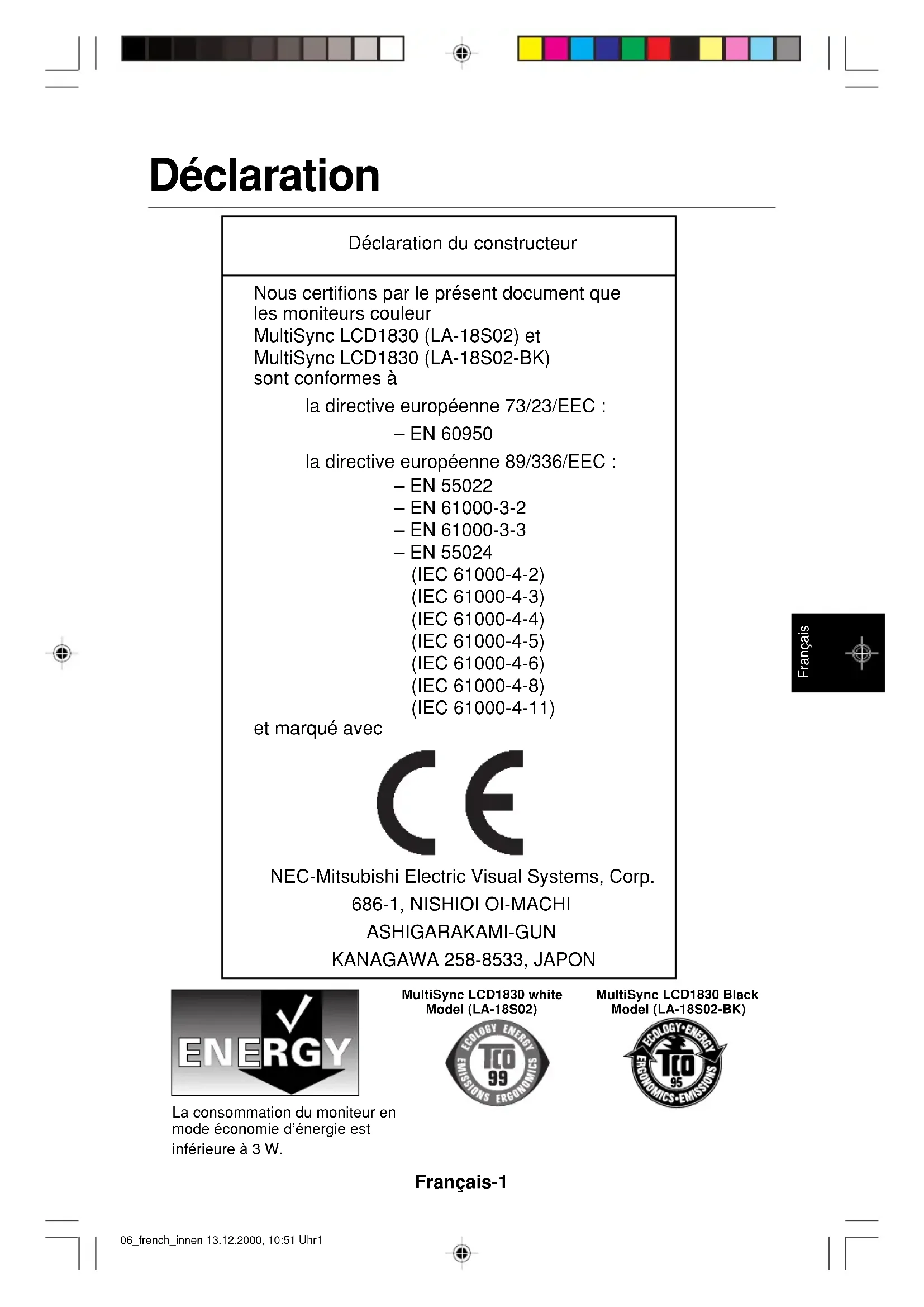, NEC-Mitsubishi Electronics Display of America Inc. juge ce produit conforme aux directives d’ENERGY STA R sur l’efficacité énergétique. L’emblème ENERGY STAR n’entraîne aucune garantie sur le produit ou service de la part d’EPA. IBM PC/XT/AT, PS/2, MCGA, VGA, 8514/A et XGA sont des marques commerciales déposées d’International Business Machines Corporation. Apple et Macintosh sont des marques déposées d’Apple Computer Inc.Microsoft et Windows sont des marques déposées de Microsoft Corporation.NEC est une marque déposée de NEC Corporation.Toutes les autres marques commerciales ou déposées appartiennent à leurs propriétaires respectifs.06_french_innen 13.12.2000, 10:51 Uhr16Italiano-1 Italiano Dichiarazione Dichiarazione del Costruttore. Con la presente si certifica che il monitor a colori MultiSync LCD1830 (LA-18S02) e MultiSync LCD1830 (LA-18S02-BK) è conforme a Direttiva del Consiglio Europeo 73/23/CEE: – EN 60950 Direttiva del Consiglio Europeo 89/336/CEE: – EN 55022 – EN 61000-2-3 – EN 61000-3-3 – EN 55024 (IEC61000-4-2) (IEC61000-4-3) (IEC61000-4-4) (IEC61000-4-5) (IEC61000-4-6) (IEC61000-4-8) (IEC61000-4-11) ed è contrassegnato con NEC-Mitsubishi Electric Visual Systems, Corp.