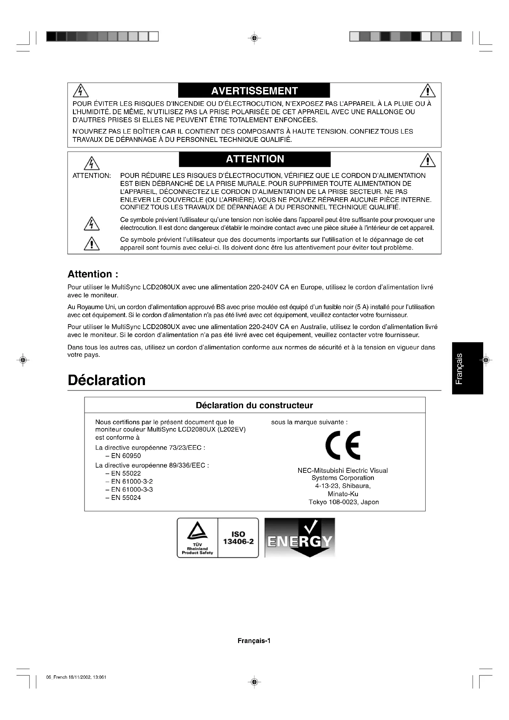 - No utilice el color azul primario en un fondo oscuro, ya que no se ve fácilmente y dado que el contraste es insuficiente, podría provocarle fatiga en los ojos. 05_Spain 18/11/2002, 13:0610Français Français-1 AVERTISSEMENT ATTENTION ATTENTION: POUR RÉDUIRE LES RISQUES D’ÉLECTROCUTION, VÉRIFIEZ QUE LE CORDON D’ALIMENTATION EST BIEN DÉBRANCHÉ DE LA PRISE MURALE. POUR SUPPRIMER TOUTE ALIMENTATION DE L’APPAREIL, DÉCONNECTEZ LE CORDON D’ALIMENTATION DE LA PRISE SECTEUR. NE PAS ENLEVER LE COUVERCLE (OU L’ARRIÈRE). VOUS NE POUVEZ RÉPARER AUCUNE PIÈCE INTERNE. CONFIEZ TOUS LES TRAVAUX DE DÉPANNAGE À DU PERSONNEL TECHNIQUE QUALIFIÉ. Ce symbole prévient l’utilisateur qu’une tension non isolée dans l’appareil peut être suffisante pour provoquer une électrocution. Il est donc dangereux d’établir le moindre contact avec une pièce située à l’intérieur de cet appareil. Ce symbole prévient l’utilisateur que des documents importants sur l’utilisation et le dépannage de cet appareil sont fournis avec celui-ci. Ils doivent donc être lus attentivement pour éviter tout problème. Attention : Pour utiliser le MultiSync LCD2080UX avec une alimentation 220-240V CA en Europe, utilisez le cordon d’alimentation livré avec le moniteur. Au Royaume Uni, un cordon d’alimentation approuvé BS avec prise moulée est équipé d’un fusible noir (5 A) installé pour l’utilisation avec cet équipement. Si le cordon d’alimentation n’a pas été livré avec cet équipement, veuillez contacter votre fournisseur. Pour utiliser le MultiSync LCD2080UX avec une alimentation 220-240V CA en Australie, utilisez le cordon d’alimentation livré avec le moniteur. Si le cordon d’alimentation n’a pas été livré avec cet équipement, veuillez contacter votre fournisseur. Dans tous les autres cas, utilisez un cordon d’alimentation conforme aux normes de sécurité et à la tension en vigueur dans votre pays. POUR ÉVITER LES RISQUES D’INCENDIE OU D’ÉLECTROCUTION, N’EXPOSEZ PAS L’APPAREIL À LA PLUIE OU À L’HUMIDITÉ. DE MÊME, N’UTILISEZ PAS LA PRISE POLARISÉE DE CET APPAREIL AVEC UNE RALLONGE OU D’AUTRES PRISES SI ELLES NE PEUVENT ÊTRE TOTALEMENT ENFONCÉES. N’OUVREZ PAS LE BOÎTIER CAR IL CONTIENT DES COMPOSANTS À HAUTE TENSION. CONFIEZ TOUS LES TRAVAUX DE DÉPANNAGE À DU PERSONNEL TECHNIQUE QUALIFIÉ. Déclaration Déclaration du constructeur Nous certifions par le présent document que le moniteur couleur MultiSync LCD2080UX (L202EV) est conforme à La directive européenne 73/23/EEC : – EN 60950 La directive européenne 89/336/EEC : – EN 55022 – EN 61000-3-2 – EN 61000-3-3 – EN 55024 sous la marque suivante : NEC-Mitsubishi Electric Visual Systems Corporation 4-13-23, Shibaura, Minato-Ku Tokyo 108-0023, Japon 06_French 18/11/2002, 13:061Français-2 Contenu L’emballage* de votre nouveau moniteur MultiSync LCD NEC doit contenir les éléments suivants :