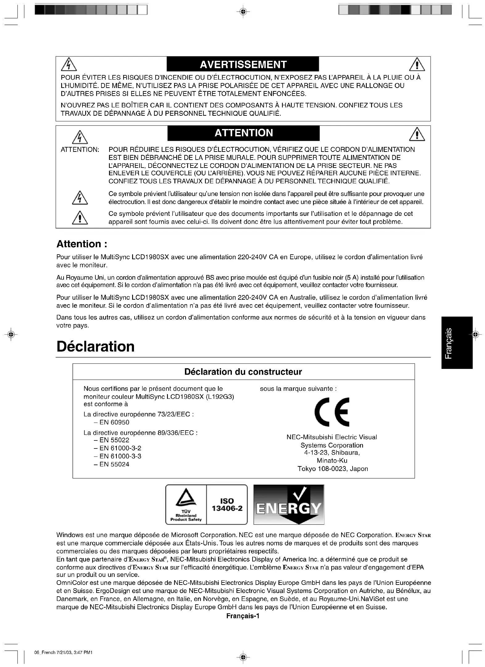 - No utilice el color azul primario en un fondo oscuro, ya que no se ve fácilmente y dado que el contraste es insuficiente, podría provocarle fatiga en los ojos. 05_Spain 7/21/03, 3:46 PM10Français Français-1 AVERTISSEMENT ATTENTION ATTENTION: POUR RÉDUIRE LES RISQUES D’ÉLECTROCUTION, VÉRIFIEZ QUE LE CORDON D’ALIMENTATION EST BIEN DÉBRANCHÉ DE LA PRISE MURALE. POUR SUPPRIMER TOUTE ALIMENTATION DE L’APPAREIL, DÉCONNECTEZ LE CORDON D’ALIMENTATION DE LA PRISE SECTEUR. NE PAS ENLEVER LE COUVERCLE (OU L’ARRIÈRE). VOUS NE POUVEZ RÉPARER AUCUNE PIÈCE INTERNE. CONFIEZ TOUS LES TRAVAUX DE DÉPANNAGE À DU PERSONNEL TECHNIQUE QUALIFIÉ. Ce symbole prévient l’utilisateur qu’une tension non isolée dans l’appareil peut être suffisante pour provoquer une électrocution. Il est donc dangereux d’établir le moindre contact avec une pièce située à l’intérieur de cet appareil. Ce symbole prévient l’utilisateur que des documents importants sur l’utilisation et le dépannage de cet appareil sont fournis avec celui-ci. Ils doivent donc être lus attentivement pour éviter tout problème. Attention : Pour utiliser le MultiSync LCD1980SX avec une alimentation 220-240V CA en Europe, utilisez le cordon d’alimentation livré avec le moniteur. Au Royaume Uni, un cordon d’alimentation approuvé BS avec prise moulée est équipé d’un fusible noir (5 A) installé pour l’utilisation avec cet équipement. Si le cordon d’alimentation n’a pas été livré avec cet équipement, veuillez contacter votre fournisseur. Pour utiliser le MultiSync LCD1980SX avec une alimentation 220-240V CA en Australie, utilisez le cordon d’alimentation livré avec le moniteur. Si le cordon d’alimentation n’a pas été livré avec cet équipement, veuillez contacter votre fournisseur. Dans tous les autres cas, utilisez un cordon d’alimentation conforme aux normes de sécurité et à la tension en vigueur dans votre pays. POUR ÉVITER LES RISQUES D’INCENDIE OU D’ÉLECTROCUTION, N’EXPOSEZ PAS L’APPAREIL À LA PLUIE OU À L’HUMIDITÉ. DE MÊME, N’UTILISEZ PAS LA PRISE POLARISÉE DE CET APPAREIL AVEC UNE RALLONGE OU D’AUTRES PRISES SI ELLES NE PEUVENT ÊTRE TOTALEMENT ENFONCÉES. N’OUVREZ PAS LE BOÎTIER CAR IL CONTIENT DES COMPOSANTS À HAUTE TENSION. CONFIEZ TOUS LES TRAVAUX DE DÉPANNAGE À DU PERSONNEL TECHNIQUE QUALIFIÉ. Déclaration Déclaration du constructeur Nous certifions par le présent document que le moniteur couleur MultiSync LCD1980SX (L192G3) est conforme à La directive européenne 73/23/EEC : – EN 60950 La directive européenne 89/336/EEC : – EN 55022 – EN 61000-3-2 – EN 61000-3-3 – EN 55024 sous la marque suivante : NEC-Mitsubishi Electric Visual Systems Corporation 4-13-23, Shibaura, Minato-Ku Tokyo 108-0023, Japon Windows est une marque déposée de Microsoft Corporation. NEC est une marque déposée de NEC Corporation. ENERGY STAR est une marque commerciale déposée aux États-Unis. Tous les autres noms de marques et de produits sont des marques commerciales ou des marques déposées par leurs propriétaires respectifs. En tant que partenaire d’ENERGY STAR