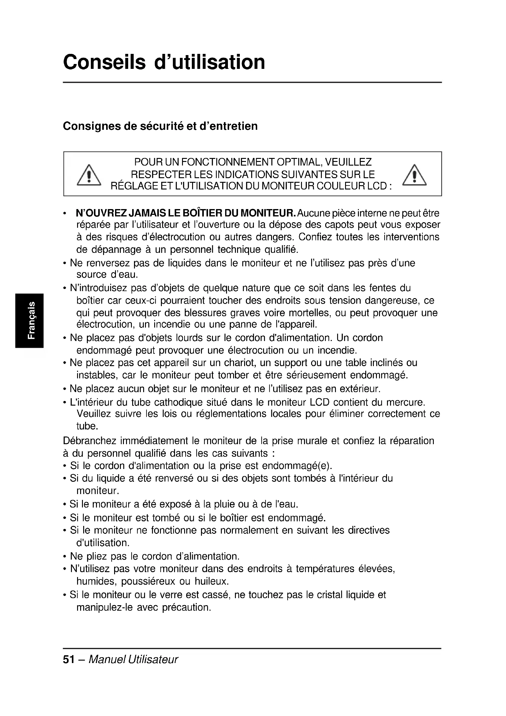 - Régler l'image avec la fonction « Fréquence ». Si le problème persiste, régler l'image avec la fonction « Piste ». 63 – Manuel Utilisateur FrançaisSignal d’avertissement Il vous arrivera probablement de rencontrer des messages d’avertissement sur cet écran LCD. Cela signifie que l’affichage LCD ne peut pas recevoir exactement le signal provenant de la carte graphique de l’ordinateur. Trois sortes de situations peuvent se présenter. Vérifiez les câbles connectés ou contactez votre vendeur local pour obtenir des informations complémentaires.