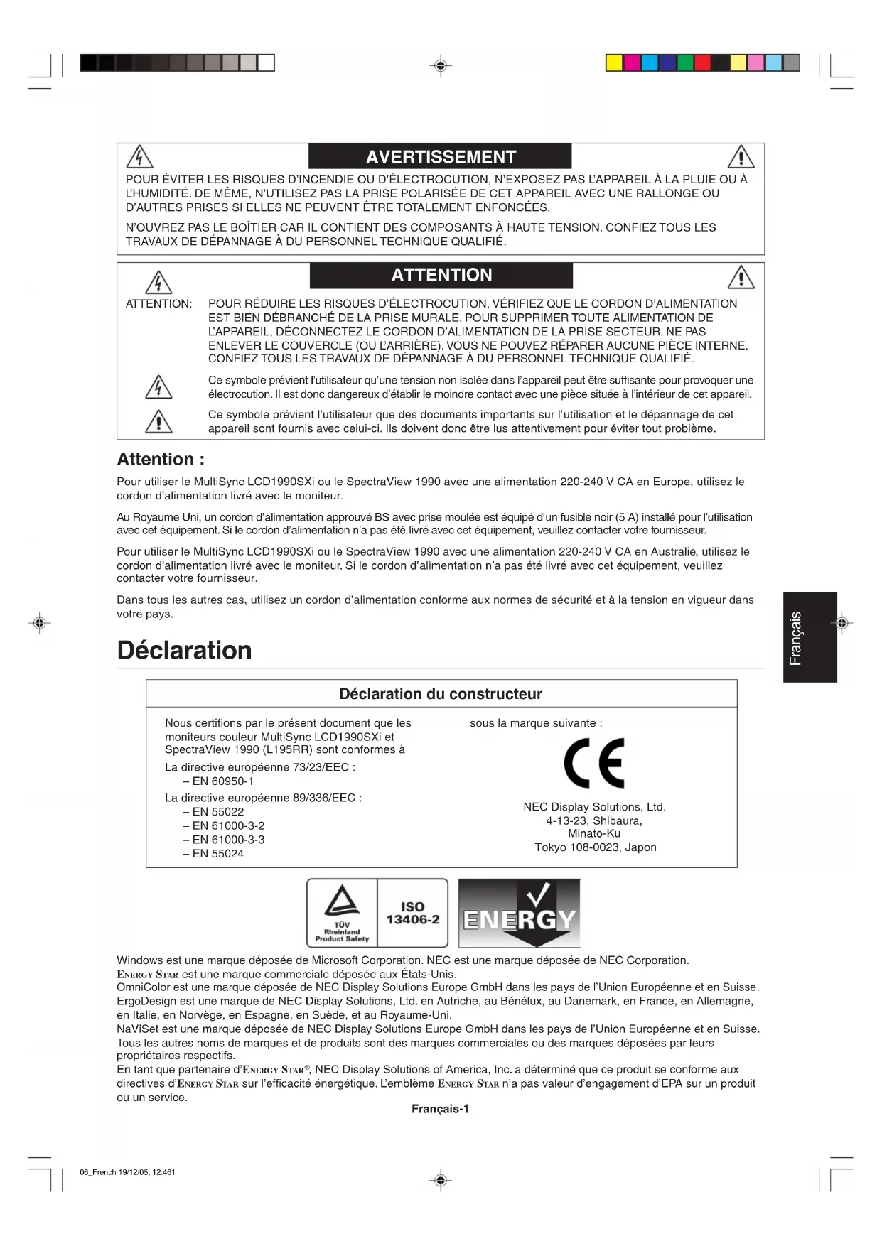 - Para limpiar la carcasa, humedezca el paño con detergente neutro y agua, páselo por la carcasa y repáselo con otro paño seco. NOTA: la superficie de la carcasa está formada por una gran cantidad de materiales plásticos. NO la limpie con benceno, diluyente, detergente alcalino, detergente con componentes alcohólicos, limpiacristales, cera, abrillantador, jabón en polvo ni insecticida. Procure que la carcasa no permanezca en contacto con goma o vinilo durante mucho tiempo. Estos tipos de líquidos y de tejidos pueden hacer que la pintura se deteriore, se resquebraje o se despegue. 05_Spain 19/12/05, 12:4613Español-14 05_Spain 19/12/05, 12:4614Français Français-1 AVERTISSEMENT ATTENTION ATTENTION: POUR RÉDUIRE LES RISQUES D’ÉLECTROCUTION, VÉRIFIEZ QUE LE CORDON D’ALIMENTATION EST BIEN DÉBRANCHÉ DE LA PRISE MURALE. POUR SUPPRIMER TOUTE ALIMENTATION DE L’APPAREIL, DÉCONNECTEZ LE CORDON D’ALIMENTATION DE LA PRISE SECTEUR. NE PAS ENLEVER LE COUVERCLE (OU L’ARRIÈRE). VOUS NE POUVEZ RÉPARER AUCUNE PIÈCE INTERNE. CONFIEZ TOUS LES TRAVAUX DE DÉPANNAGE À DU PERSONNEL TECHNIQUE QUALIFIÉ. Ce symbole prévient l’utilisateur qu’une tension non isolée dans l’appareil peut être suffisante pour provoquer une électrocution. Il est donc dangereux d’établir le moindre contact avec une pièce située à l’intérieur de cet appareil. Ce symbole prévient l’utilisateur que des documents importants sur l’utilisation et le dépannage de cet appareil sont fournis avec celui-ci. Ils doivent donc être lus attentivement pour éviter tout problème. Attention : Pour utiliser le MultiSync LCD1990SXi ou le SpectraView 1990 avec une alimentation 220-240 V CA en Europe, utilisez le cordon d’alimentation livré avec le moniteur. Au Royaume Uni, un cordon d’alimentation approuvé BS avec prise moulée est équipé d’un fusible noir (5 A) installé pour l’utilisation avec cet équipement. Si le cordon d’alimentation n’a pas été livré avec cet équipement, veuillez contacter votre fournisseur. Pour utiliser le MultiSync LCD1990SXi ou le SpectraView 1990 avec une alimentation 220-240 V CA en Australie, utilisez le cordon d’alimentation livré avec le moniteur. Si le cordon d’alimentation n’a pas été livré avec cet équipement, veuillez contacter votre fournisseur. Dans tous les autres cas, utilisez un cordon d’alimentation conforme aux normes de sécurité et à la tension en vigueur dans votre pays. POUR ÉVITER LES RISQUES D’INCENDIE OU D’ÉLECTROCUTION, N’EXPOSEZ PAS L’APPAREIL À LA PLUIE OU À L’HUMIDITÉ. DE MÊME, N’UTILISEZ PAS LA PRISE POLARISÉE DE CET APPAREIL AVEC UNE RALLONGE OU D’AUTRES PRISES SI ELLES NE PEUVENT ÊTRE TOTALEMENT ENFONCÉES. N’OUVREZ PAS LE BOÎTIER CAR IL CONTIENT DES COMPOSANTS À HAUTE TENSION. CONFIEZ TOUS LES TRAVAUX DE DÉPANNAGE À DU PERSONNEL TECHNIQUE QUALIFIÉ. Déclaration Déclaration du constructeur Nous certifions par le présent document que les moniteurs couleur MultiSync LCD1990SXi et SpectraView 1990 (L195RR) sont conformes à La directive européenne 73/23/EEC : – EN 60950-1 La directive européenne 89/336/EEC : – EN 55022 – EN 61000-3-2 – EN 61000-3-3 – EN 55024 sous la marque suivante : NEC Display Solutions, Ltd. 4-13-23, Shibaura, Minato-Ku Tokyo 108-0023, Japon Windows est une marque déposée de Microsoft Corporation. NEC est une marque déposée de NEC Corporation. ENERGY STAR est une marque commerciale déposée aux États-Unis. OmniColor est une marque déposée de NEC Display Solutions Europe GmbH dans les pays de l’Union Européenne et en Suisse. ErgoDesign est une marque de NEC Display Solutions, Ltd. en Autriche, au Bénélux, au Danemark, en France, en Allemagne, en Italie, en Norvège, en Espagne, en Suède, et au Royaume-Uni. NaViSet est une marque déposée de NEC Display Solutions Europe GmbH dans les pays de l’Union Européenne et en Suisse. Tous les autres noms de marques et de produits sont des marques commerciales ou des marques déposées par leurs propriétaires respectifs. En tant que partenaire d’ENERGY STAR