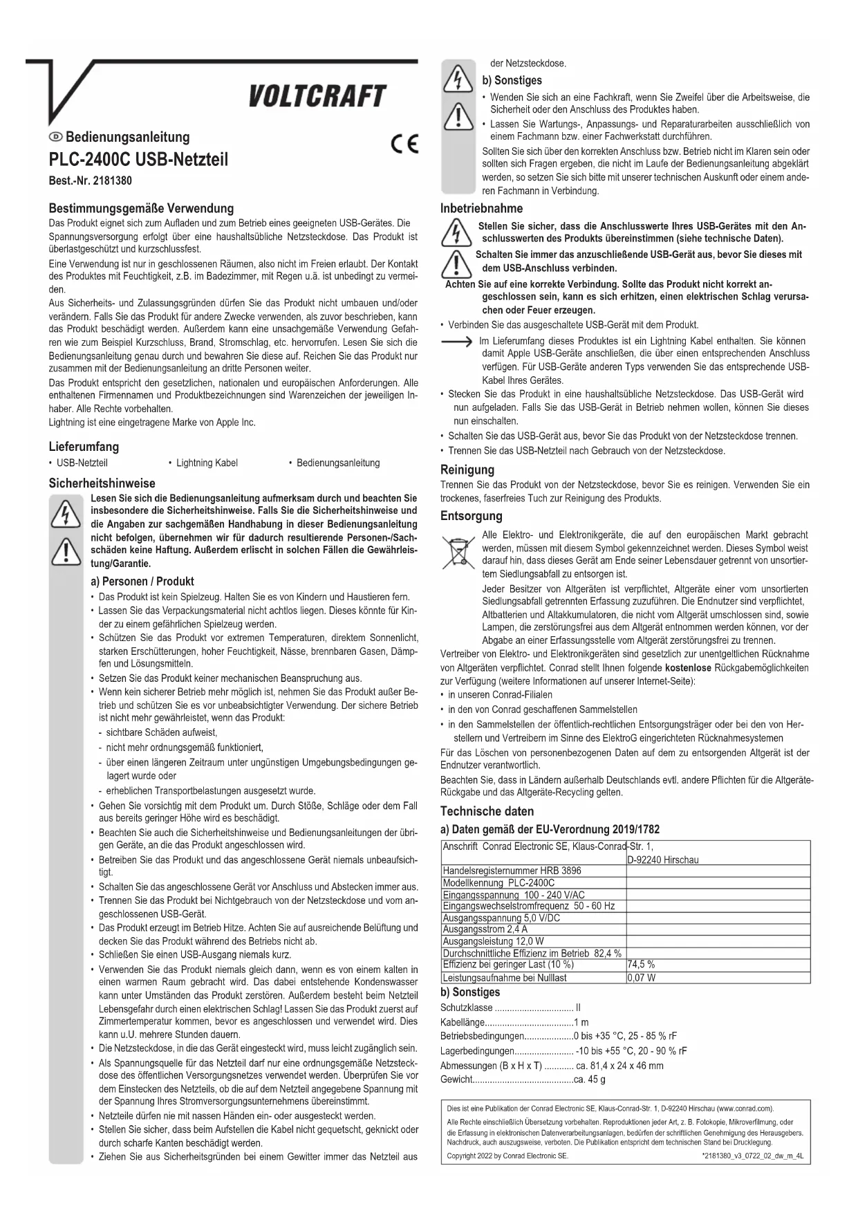 - dans les points de collecte des organismes de droit public chargés de l‘élimination des déchets ou auprès des systèmes de reprise mis en place par les fabricants et les distributeurs au sens de la loi sur les équipements électriques et électroniques (ElektroG) L‘utilisateur nal est responsable de l‘effacement des données personnelles sur l‘équipement usagé à mettre au rebut. Veuillez noter que dans les pays autres que l‘Allemagne, d‘autres obligations peuvent s‘appliquer pour la remise et le recyclage des appareils usagés. Données techniques a) Données conformes au règlement de l’UE 2019/1782 Fabricant Conrad Electronic SE, Klaus-Conrad-Str. 1, D-92240 Hirschau Numéro d’enregistrement au registre du commerce HRB 3896 Référence du modèle PLC-2400C Tension d’entrée 100 - 240 V/CA Fréquence du CA d’entrée 50 - 60 Hz Tension de sortie 5,0 V/CC Courant de sortie 2,4 A Puissance de sortie 12,0 W Rendement moyen en mode actif 82,4 % Rendement à faible charge (10 %) 74,5 % Consommation électrique hors charge 0,07 W b) Autres Classe de protection ..................... II Longueur du câble ........................ 1 m Conditions de service ................... 0 à +35 °C, 25 - 85 % humidité rélative Conditions de stockage ................ -10 à +55 °C, 20 - 90 % humidité rélative Dimensions (L x H x P) ................. env. 81,4 x 24 x 46 mm Poids ............................................. env. 45 g Mode D’emploi PLC-2400C Bloc d’alimentation avec USB Best.-Nr. 2181380 Utilisation prévue Ce produit permet de recharger et d‘alimenter un appareil USB compatible. Il se branche sur une prise de courant standard. Ce produit est protégé contre les risques de surcharge et de court-circuit. L‘utilisation est uniquement autorisée en intérieur, dans les locaux fermés ; l‘utilisation en plein air est interdite. Tout contact avec l‘humidité (par ex.: pluie, salle de bain etc.) est à éviter absolument. Pour des raisons de sécurité et d‘homologation, toute transformation et/ou modication du pro- duit est interdite. Si vous utilisez le produit à d‘autres ns que celles décrites précédemment, cela risque d‘endommager le produit. Par ailleurs, une utilisation incorrecte peut être source de dangers tels que court-circuit, incendie, électrocution. Lisez attentivement le mode d‘emploi et conservez le. Ne transmettez le produit à des tiers qu‘accompagné de son mode d‘emploi. Le produit est conforme aux exigences des directives européennes et nationales en vigueur. Tous les noms d‘entreprises et appellations de produits contenus dans ce mode d‘emploi sont des marques déposées des propriétaires correspondants. Tous droits réservés. Lightning est une marque déposée d‘Apple Inc. Contenud‘emballage