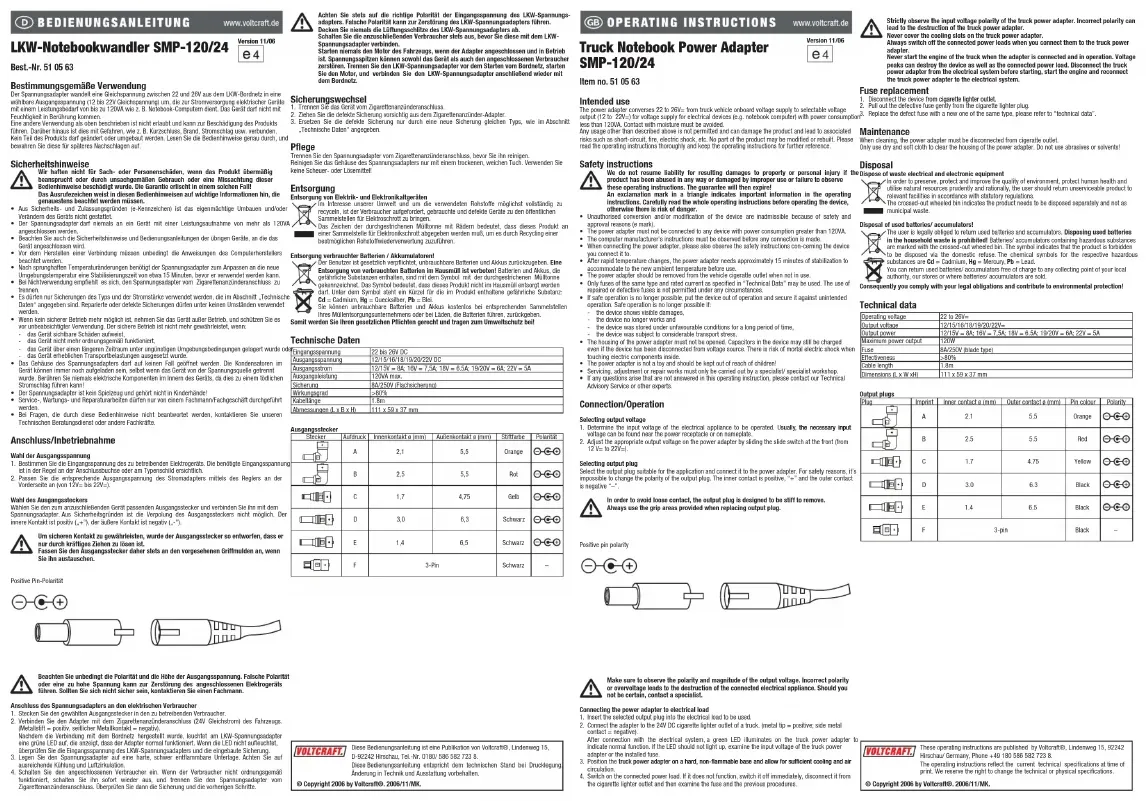 Diese Bedienungsanleitung ist eine Publikation von Voltcraft®, Lindenweg 15, D-92242 Hirschau, Tel.-Nr. 0180/ 586 582 723 8. Diese Bedienungsanleitung entspricht dem technischen Stand bei Drucklegung. Änderung in Technik und Ausstattung vorbehalten. © Copyright 2006 by Voltcraft®. 2006/11/MK. These operating instructions are published by Voltcraft®, Lindenweg 15, 92242 Hirschau/ Germany, Phone +49 180 586 582 723 8. The operating instructions reflect the current technical specifications at time of print. We reserve the right to change the technical or physical specifications. © Copyright 2006 by Voltcraft®. 2006/11/MK. Version 11/06Adaptateur d´appareils électriques pour poids lourd SMP-120/24 N° de commande 51 05 63 Utilisation prévue L’adaptateur de courant convertit 22V en 26V= à partir de l’alimentation en tension de poids lourd vers une tension de sortie sélectionnable (de 12 à 22V=) pour l’alimentation en tension des appareils électriques (par ex, ordinateur portable) avec une consommation d’électricité inférieure à 120VA. Eviter impérativement tout contact avec l’humidité. Toute utilisation autre que celle stipulée ci-dessus n’est pas permise et peut endommager ce produit et présenter des risques de courts-circuits, d’incendie, de chocs électriques, etc. Il n’est permis ni de modifier le produit ni d’en transformer aucun élément. Veuillez bien lire ce mode d’emploi et le garder à titre de référence. Consignes de sécurité Nous déclinons toute responsabilité pour d’éventuels dommages matériels ou corporels dus à un emploi abusif, un maniement incorrect ou à la non observation des consignes de sécurité. De tels cas entraîneront l’annulation de la garantie ! Un point d’exclamation dans un triangle indique des informations importantes dans ce mode d’emploi qui doivent être strictement respectées. Pour des raisons de sécurité et d’approbation (marque e), il est interdit de modifier l’appareil et/ou d’en modifier la construction. Ne pas connecter l’adaptateur de courant aux appareils avec une consommation d’électricité supérieure à 120VA. Il convient de respecter les instructions du fabricant de l’ordinateur avant de procéder à tout raccordement. Si vous raccordez ce produit à d’autres appareils, consultez le mode d’emploi et les consignes de sécurité de ces autres appareils. Après de rapides changements de température, il faut environ 15 minutes pour permettre à l’adaptateur de courant de se stabiliser et de s’accoutumer à la nouvelle température ambiante avant emploi. Il est recommandé de débrancher l’adaptateur de courant de l’allume-cigare du véhicule quand il n’est pas utilisé. N’utiliser que des fusibles de même type et de même courant nominal ainsi que le spécifie la « Fiche technique ». Ne jamais utiliser de fusibles réparés ou défectueux. S’il n’est plus possible d’utiliser l’appareil en toute sécurité, il faut immédiatement le débrancher et le sécuriser contre tout usage involontaire. Un fonctionnement sûr n’est plus possible si : L’appareil présente des signes d’endommagement, L’appareil ne fonctionne plus et L’appareil a été stocké dans des conditions défavorables pendant une période prolongée, L’appareil a été soumis à une contrainte de transport considérable. Ne pas ouvrir le boîtier de l’adaptateur de courant. Même si l’appareil a été déconnecté de la source de tension, les condensateurs peuvent encore être sous tension. Vous risquez un choc électrique mortel si vous touchez les composantes électriques de l’appareil. L’adaptateur de courant n’est pas un jouet et doit être gardé hors de portée des enfants ! Tout entretien, ajustement ou réparation ne doit être effectué que par un spécialiste/atelier spécialisé. Si vous avez des questions auxquelles le mode d’emploi n’a pas pu répondre, consultez notre service de renseignements techniques ou un spécialiste. Raccordement/Utilisation Sélection de la tension de sortie Déterminer la tension d’entrée de l’appareil électrique devant être utilisé. D’habitude, la tension d’entrée requise figure sur le réceptacle de courant ou sur la plaque du fabricant. Régler la tension de sortie appropriée sur l’adaptateur de courant en faisant coulisser le commutateur à coulisse situé à l’avant (de 12V= à 22V=). Sélection de la prise de sortie Sélectionner la prise de sortie convenant à l’usage souhaité et la connecter à l’adaptateur de courant. Pour des raisons de sécurité, il est impossible de changer la polarité de la prise de sortie. Le contact intérieur est positif, « + » et le contact extérieur est négatif « - ». La prise de sortie a été conçue pour être difcile à enlever an d’éviter tout contact lâche. Pour remplacer la prise de sortie, toujours se servir des zones de préhension. Polarité de la broche positive Veiller à respecter la polarité et la magnitude de la tension de sortie. Une polarité incorrecte ou une surtension détruiront l’appareil électrique raccordé. Consulter un spécialiste en cas de doute. Raccordement de l’adaptateur de courant à la charge électrique Insérer la prise de sortie choisie dans l’appareil électrique que vous souhaitez utiliser. Connecter l’adaptateur à la sortie de 24V= de l’allume-cigare du poids lourd ; pointe métallique = positif ; contact métallique latéral = négatif. Une DEL verte indiquant le bon fonctionnement de l’appareil s’allume sur l’adaptateur d’appareils du poids lourd lorsqu’il a été connecté au système électrique. Si la DEL ne s’allume pas, vérifier la tension d’entrée de l’adaptateur d’appareils dupoids lourd ou le fusible installé. Placer l’adaptateur de courant sur une surface dure et ignifuge et veiller à une ventilation et une circulation d’air suffisantes. Allumer la charge électriqu