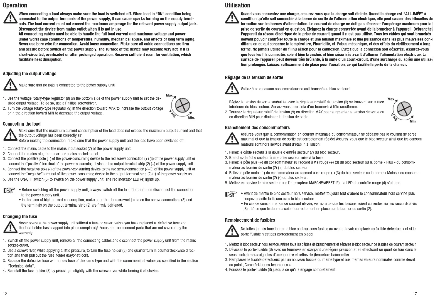 Utilisation Quand vous connectez une charge, assurez-vous que la charge soit éteinte. Quand la charge est “ALLUMÉE” à condition qu’elle soit connectée à la borne de sortie de l’alimentation électrique, elle peut causer des étincelles de formation sur les bornes d’alimentation. Le courant de charge ne doit pas dépasser l’ampérage maximum pour la prise de sortie du courant en question. Éteignez la charge connectée avant de la brancher à l’appareil. Débranchez l’appareil du réseau électrique de la prise de courant quand il n’est pas utilisé. Tous les câbles qui sont branchés doivent pouvoir contrôler toute la charge et une tension maximale et une puissance dans les plus mauvaises con- ditions en ce qui concerne la température, l’humidité, et l’abus mécanique, et des effets du vieillissement à long terme. Ne jamais utiliser du l nu aérien pour la connexion. Évitez que la connexion soit déserrée. Assurez-vous que tous les ls connectés soient bien branchés et bien sécurisés avant d’allumer l’alimentation électrique. La surface de l’appareil peut devenir très brûlante, à la suite d’un court-circuit, d’une surcharge ou après une utilisa- tion prolongée. Laissez sufsamment de place pour l’aération, ce qui facilite la perte de la chaleur. Réglage de la tension de sortie Veillez à ce qu’aucun consommateur ne soit branché au bloc secteur! Réglez la tension de sortie souhaitée avec le régulateur rotatif de tension (9) se trouvant sur la face inférieure du bloc secteur. Servez-vous pour cela d’un tournevis à tête cruciforme. Tournez le régulateur rotatif de tension (9) en direction MAX pour augmenter la tension de sortie ou en direction MIN pour diminuer la tension de sortie. Branchement des consommateurs Assurez-vous que la consommation en courant maximale du consommateur ne dépasse pas le courant de sortie maximal et que la tension de sortie est correctement réglée! Assurez-vous que le bloc secteur ainsi que les consom- mateurs sont hors service avant d’établir la liaison! Reliez le câble secteur à la douille d’entrée secteur (7) du bloc secteur. Branchez la fiche secteur à une prise secteur mise à la terre. Reliez le pôle plus (+) du consommateur au raccord à vis rouge (+) (3) du bloc secteur ou la borne « Plus » du consom- mateur au bornier de sortie (2) (+) du bloc secteur. Reliez le pôle moins (-) du consommateur au raccord à vis rouge (-) (3) du bloc secteur ou la borne « Moins » du consom- mateur au bornier de sortie (2) (-) du bloc secteur. Mettez en service le bloc secteur par l’interrupteur MARCHE/ARRET (5). La LED de contrôle rouge (4) s’allume.