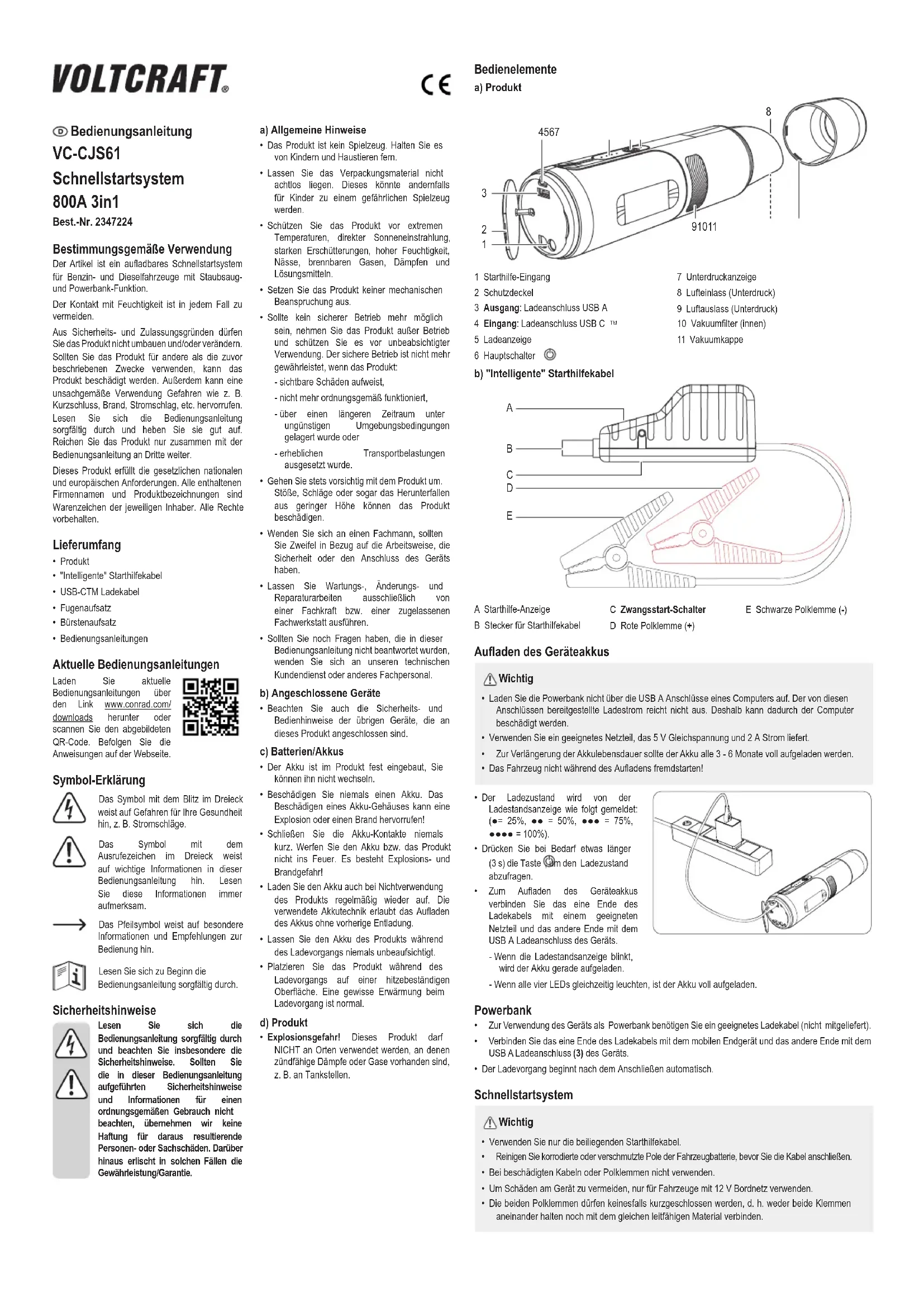 - Ne court-circuitez jamais les bornes bipolaires, par exemple ne serrez pas les deux câbles ensemble ou sur la même pièce de matériau conducteur. Mode d’emploi VC-CJS61 Système de démarrage rapide 800 A 3en1 N° de commande 2347224 Utilisation prévue Ce produit est un système rechargeable d’aspiration, de batterie powerbank et de démarrage rapide pour les moteurs à essence et diesel. Dans tous les cas, le contact avec l’humidité doit être évité. Pour des raisons de sécurité et d’homologation, toute restructuration et/ou modication du produit est interdite. Toute utilisation à des ns autres que celles décrites ci-dessus pourrait endommager le produit. De plus, une mauvaise utilisation pourrait entraîner des risques tels que les courts-circuits, les incendies, les chocs électriques, etc. Lisez attentivement les instructions du mode d’emploi et conservez-le dans un endroit sûr. Ne mettez ce produit à la disposition de tiers qu’avec son mode d’emploi. Ce produit est conforme aux exigences nationales et européennes en vigueur. Tous les noms d’entreprises et appellations de produits sont des marques commerciales de leurs propriétaires respectifs. Tous droits réservés. Contenu de l’emballage