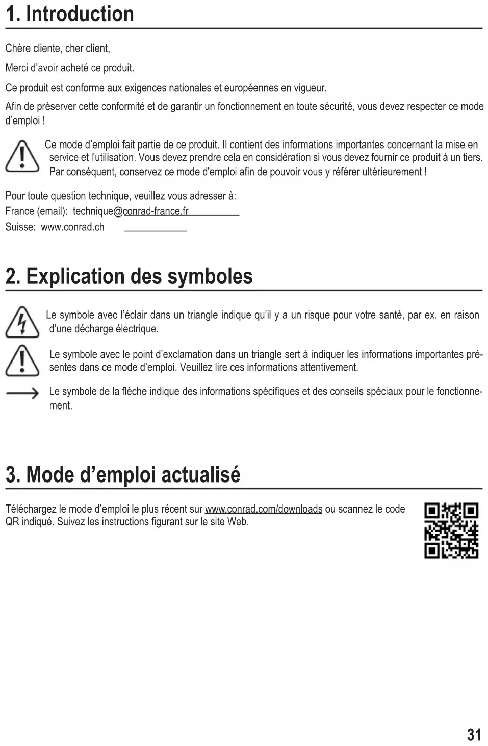 Chère cliente, cher client, Merci d’avoir acheté ce produit. Ce produit est conforme aux exigences nationales et européennes en vigueur. Andepréservercetteconformitéetdegarantirunfonctionnemententoutesécurité,vousdevezrespectercemode d’emploi ! Ce mode d’emploi fait partie de ce produit. Il contient des informations importantes concernant la mise en service et l'utilisation. Vous devez prendre cela en considération si vous devez fournir ce produit à un tiers. Parconséquent,conservezcemoded'emploiandepouvoirvousyréférerultérieurement! Pour toute question technique, veuillez vous adresser à: France (email): technique@conrad-france.fr Suisse: www.conrad.ch