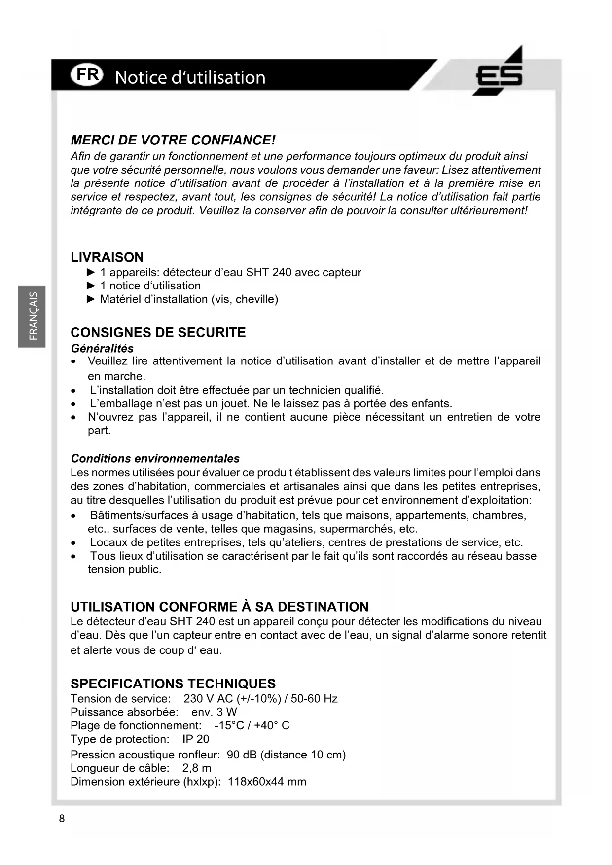 - The warranty does not aect your statutory rights as consumer. RETURN SHIPMENT Should your device be defective, we oer you the following option: Contact Elektrotechnik Schabus by Phone +49 (0) 80 36 / 67 49 79 - 0 Fax +49 (0) 80 36 / 67 49 79 - 79 Email info@elektrotechnik-schabus.de8 MERCI DE VOTRE CONFIANCE! An de garantir un fonctionnement et une performance toujours optimaux du produit ainsi que votre sécurité personnelle, nous voulons vous demander une faveur: Lisez attentivement la présente notice d’utilisation avant de procéder à l’installation et à la première mise en service et respectez, avant tout, les consignes de sécurité! La notice d’utilisation fait partie intégrante de ce produit. Veuillez la conserver an de pouvoir la consulter ultérieurement! LIVRAISON ► 1 appareils: détecteur d’eau SHT 240 avec capteur ► 1 notice d‘utilisation ► Matériel d’installation (vis, cheville)