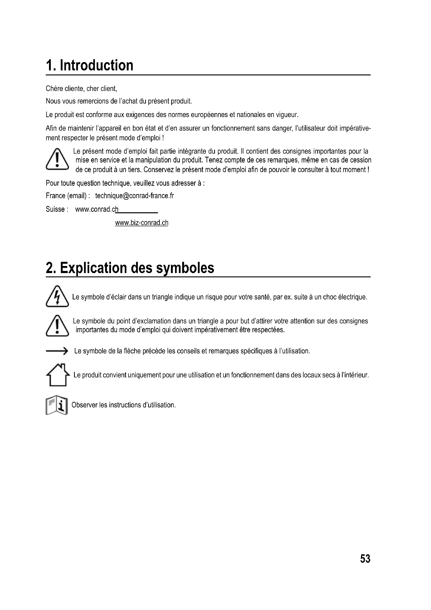 Chère cliente, cher client, Nous vous remercions de l’achat du présent produit. Le produit est conforme aux exigences des normes européennes et nationales en vigueur. Andemaintenirl’appareilenbonétatetd’enassurerunfonctionnementsansdanger,l’utilisateurdoitimpérative- ment respecter le présent mode d’emploi ! Le présent mode d’emploi fait partie intégrante du produit. Il contient des consignes importantes pour la mise en service et la manipulation du produit. Tenez compte de ces remarques, même en cas de cession deceproduitàuntiers.Conservezleprésentmoded’emploiandepouvoirleconsulteràtoutmoment! Pour toute question technique, veuillez vous adresser à : France (email) : technique@conrad-france.fr Suisse : www.conrad.ch www.biz-conrad.ch
