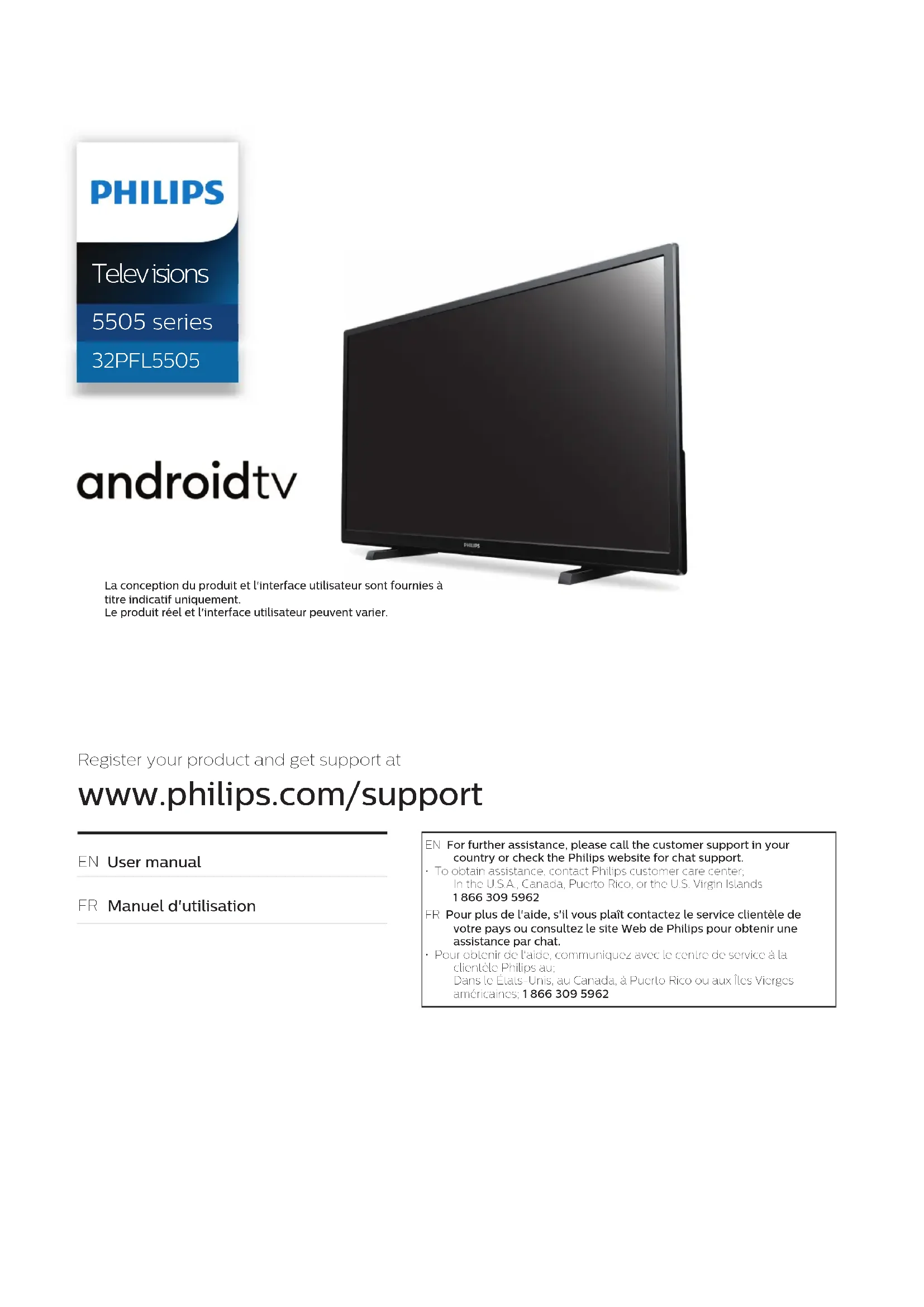 - Manuel d'utilisation Register your product and get support at www.philips.com/support EN For further assistance, please call the customer support in your country or check the Philips website for chat support.• To obtain assistance, contact Philips customer care center;In the U.S.A., Canada, Puerto Rico, or the U.S. Virgin Islands 1 866 309 5962FR Pour plus de l'aide, s'il vous plaît contactez le service clientèle de votre pays ou consultez le site Web de Philips pour obtenir une assistance par chat.• Pour obtenir de l'aide, communiquez avec le centre de service à la clientèle Philips au;Dans le États-Unis, au Canada, à Puerto Rico ou aux Îles Vierges américaines; 1 866 309 5962La conception du produit et l'interface utilisateur sont fournies à titre indicatif uniquement.Le produit réel et l'interface utilisateur peuvent varier.Table des matières 1 Avis p. 5