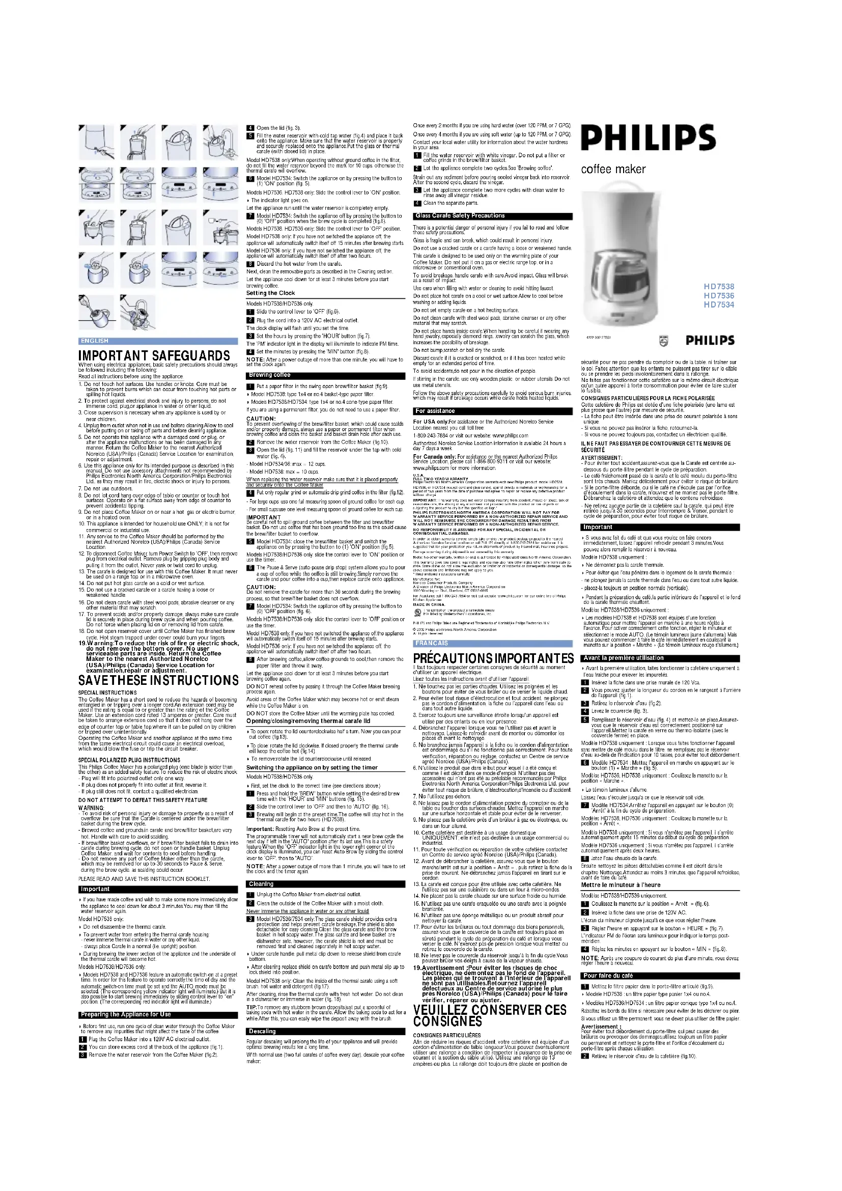 Filtrez tous les dépôts avant de verser le vinaigre refroidi dans le réservoir. Après le deuxième cycle, jetez le vinaigre. Faites fonctionner à nouveau la cafetière deux fois avec de l'eau froide afin d'éliminer le vinaigre restant. Nettoyez les parties amovibles. Mesures de sécurité pour la carafe en verre L'utilisation de la cafetière peut constituer un danger potentiel si vous ne lisez et ne suivez pas ces mesures de sécurité. Le verre est fragile et peut se casser,ce qui peut provoquer des blessures. N'utilisez pas une carafe craquelée ou une carafe avec la poignée branlante. Cette carafe a été conçue pour être utilisée uniquement sur la plaque chauffante de votre cafetière. Ne la placez pas près d'un brûleur à gaz ou électrique, ou dans un four à micro-ondes ou conventionne. Pour éviter la casse, maniez la carafe délicatement. Évitez les chocs pour ne pas casser le verre. Faites attention en la remplissant avec de l'eau pour ne pas la cogner contre le robinet. Ne placez pas la carafe sur une surface froide ou humide. Laissez refroidir avant de la nettoyer ou d'ajouter des liquides. Ne placez pas la carafe vide sur une plaque chauffante chaude. N'utilisez pas une éponge métallique ou un produit abrasif pour nettoyer la carafe. N'introduisez pas les mains à l'intérieur de la carafe. Lorsque vous la maniez, faites attention si vous portez des bijoux, surtout des bague à diamant.Vous pouvez rayer le verre et augmenter ainsi le risque de casse. Ne cognez pas, ne rayez pas et faites attention que l'eau ne s'évapore pas de la carafe. Jetez la carafe si elle est cassée, rayée ou si elle a été chauffée bien qu'elle fût vide pendant longtemps. Pour éviter tout accident,ne versez pas dans la direction de personnes. Si vous remuez le café dans la carafe, utilisez des ustensiles en bois, en plastique ou en caoutchouc. N'utilisez pas des ustensiles métalliques. Suivez les mesures de sécurité ci-dessus pour éviter les brûlures qui peuvent être provoquées par des liquides très chauds. Assistance Pour les États-Unis uniquement : Pour obtenir de plus amples renseignements ou pour communiquer avec le Centre de service agréé Norelco, téléphonez gratuitement: 1 800 243-7884 ou visitez notre site web : www.philips.com Pour obtenir de plus amples renseignements,le Centre de service agréé Norelco est disponible 24 heures par jour 7 jours par semaines. Canada uniquement : Pour obtenir de plus amples renseignements ou pour communiquer avec le Centre de service agréé Philips, téléphonez gratuitement. 1 866 800-9311 ou visitez notre website : www.philips.com États-Unis d’AmériqueGARANTIE TOTALE DEUX ANS Philips Electronics North America Corporation garantit chaque nouveau produit Philips, modèle HD7538,HD7536 ou HD7534 (à l’exception du cordon d’alimentation et de la verseuse en verre) contre toutdéfaut de fabrication et couvre la main-d'oeuvre pendant deux ans à compter de la date d’achat et assurele service gratuitement. IMPORTANT : La garantie ne couvre pas les défaillances dues à une cause accidentelle, à un mauvais usage ou à une négligence, et en cas d’utilisation d’accessoires non fournis par le constructeur, en cas deperte de pièces ou si l’appareil n’a pas été branché sur la tension spécifiée. *PHILIPS ELECTRONICS NORTH AMERICA CORPORATION N’EFFECTUERA AUCUN REMBOUSEMENT SOUS GARANTIE SI LA RÉPARATION N’A PAS ÉTÉ ASSURÉE PAR UN CENTRE DE SERVICE AGRÉÉ. LA GARANTIE NE COUVRE PAS LES DÉFAILLANCES SUITE À MODIFICATIONS OU RÉPARATIONS EFFECTUÉES PAR DES PERSONNES NON QUALIFIÉES. EN AUCUN CAS, CETTE GARANTIE NE PEUT DONNER DROIT À DOMMAGES ET INTÉRÊTS. Pour effectuer le service après-vente sous garantie, portez ou envoyez le produit port payé à un Centre deservice agréé Norelco ou téléphonez directement à PHILIPS à 1 800 243-7884 pour toute information.Nous vous recommandons pour votre protection d’assurer les produits envoyés par la poste en contractantune assurance transport. Cette garantie ne couvre pas les dommages provoqués pendant le transport. Note : Aucune autre garantie, écrite ou orale, n’est acceptée par Philips Electronics North America Corporation. Cette garantie couvre les conditions relatives à la garantie légale, et autres conditionsspécifiques en fonction des états. Certains états ne permettent pas de limitation de garantie en cas dedéfaillance due à une cause accidentelle ou un mauvais usage. Dans ce cas précis, ce paragraphe est sansobjet.* Lire les instructions ci-incluses attentivement.Fabriqué pour:Norelco Consumer Products CompanyA Division of Philips Electronics North America Corporation1010 Washington Blvd., Stamford, CT 06912- 0015Pour toute information, téléphonez au 1 800 243-7884 ou visitez notre site web :www.philips.com pour notre gamme entière d’appareils électroménagers Philips.FABRIQUÉ EN CHINE.Ce symbole sur la plaque de fabrication signifie qu’il est enregistré par Underwriters’ Laboratories, Inc. PHILIPS et le logo Philips sont des marques déposées de Koninklijke Philips Electronics N. V.© 2002 Philips Electronics North America Corporation.Tous droits réservés. ESPAÑOL PRECAUCIONES IMPORTANTES Cuando utilice aparatos eléctricos, debe tomar siempre medidas de seguridad básicas, entre las que se incluyen las siguientes: Lea todas las instrucciones antes de utilizar elaparato