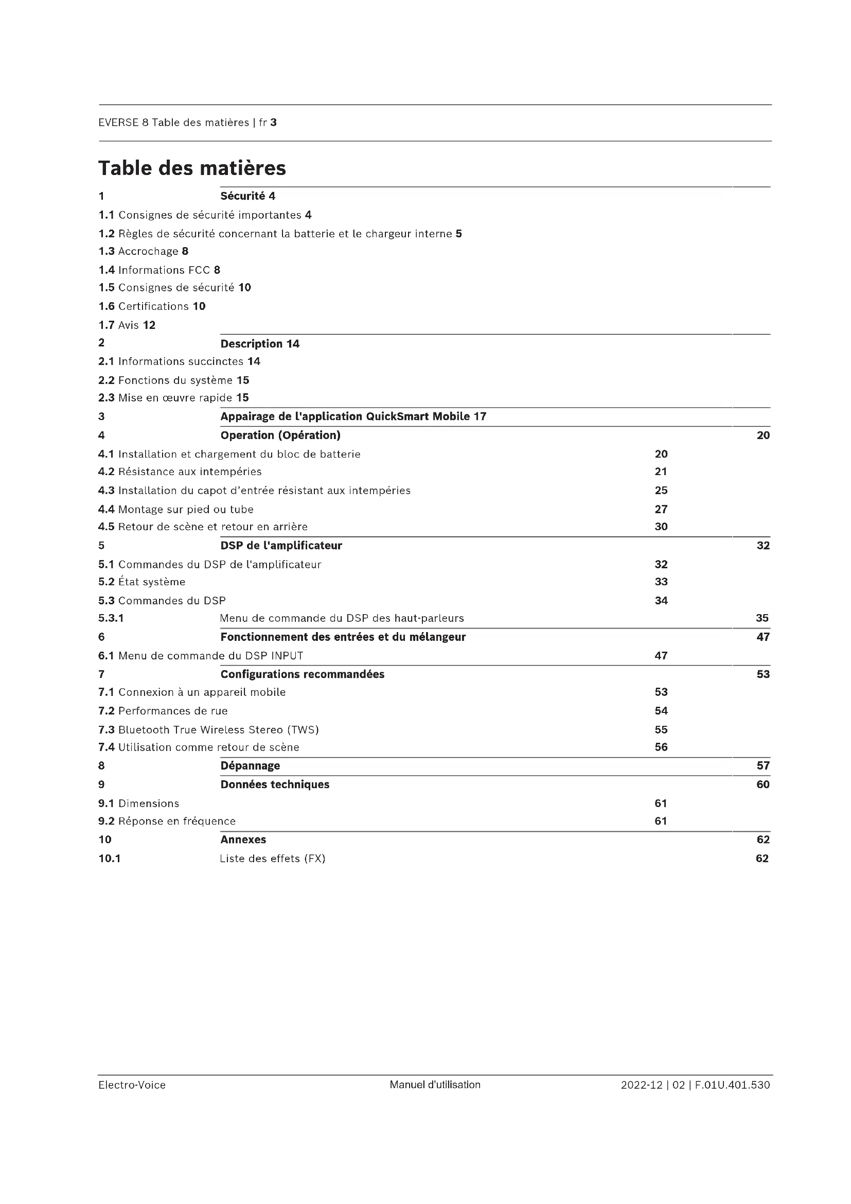 Manuel d'utilisationEVERSE 8 Table des matières | fr 3 Electro-Voice Manuel d'utilisation 2022-12 | 02 | F.01U.401.530 Table des matières