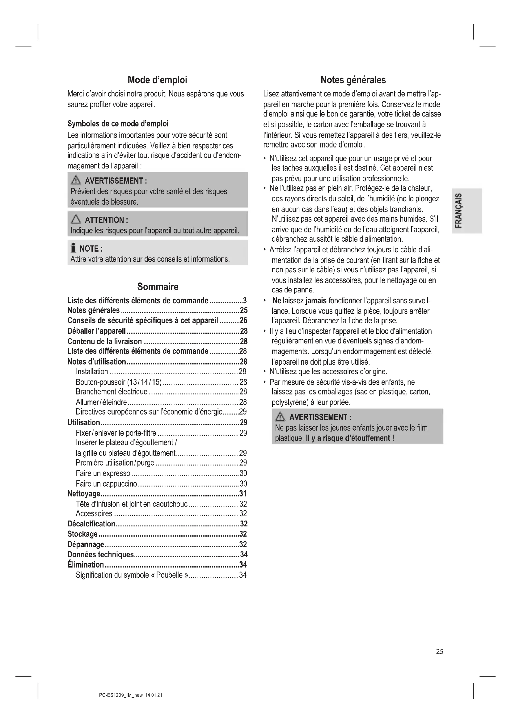 - Utilisez cet appareil uniquement dans un endroit sec et à l’inté- rieur. Cet appareil est destiné à un usage domestique ou assimilé comme par exemple : - dans les cuisines des employés de magasins, de bureaux et d’autres environnements professionnels. Cette machine n’est pas conçue pour être utilisée dans les fermes ou les environnements de type chambre d’hôte ou par les clients dans les hôtels, motels et autres environnements de type résidentiel.PC-ES1209_IM_new 14.01.21