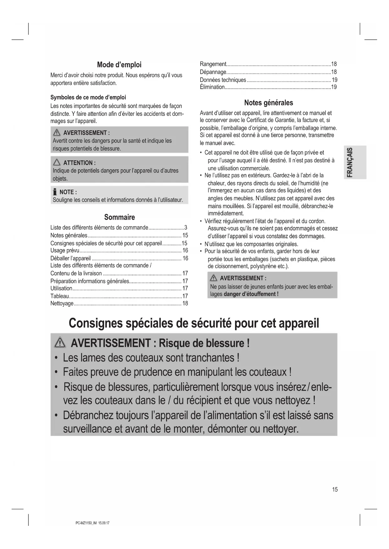 - Gardez toujours l’appareil hors de la portée des enfants dans un endroit sec et bien ventilé. Dépannage L’appareil ne fonctionne pas. Solution : Vériez le branchement électrique. D’autres raisons possibles : L’appareil est équipé d’un interrupteur de sécurité. Il empêche le démarrage boîtier du moteur. Solution : Vériez que le bloc-moteur, le couvercle de sécurité et la couteaux sont correctement installés.19 PC-MZ1150_IM 15.09.17 Données techniques Modèle : ................................................................PC-MZ 1150 Alimentation : .......................................220 - 240 V~, 50 / 60 Hz Consommation électrique : .............................................400 W Classe de protection : ............................................................. Fonctionnement de courte durée : ...... 45 secondes en marche / 2 minutes à l’arrêt Capacité : ................................................................env. 1 liters Poids net : ..............................................................env. 1,95 kg Nous nous réservons le droit d’apporter des modications techniques ainsi que des modications de conception dans le cadre du développement continu de nos produits. Cet appareil est conforme à toutes les directives CE en vigueur, telles que les directives sur la compatibilité électro- magnétique et les faibles tensions et a été fabriqué selon les derniers règlements de sécurité. Élimination Signication du symbole de « Poubelle à roulettes » Protégez votre environnement, ne jetez pas vos appareils électriques avec les ordures ména- gères. Utilisez, pour l’élimination de vos appareils élec- triques, les bornes de collecte prévues à cet effet où vous pouvez vous débarrasser des appareils que vous n’utilisez plus. Vous contribuez ainsi à éviter les impacts potentiels dans l’environnement et sur la santé de chacun, causés par une mauvaise élimination de ces déchets. Vous contribuez aussi au recyclage sous toutes ses formes des appareils électriques et électroniques usagés. Vous trouverez toutes les informations sur les bornes d’élimination des appareils auprès de votre commune ou de l’administration de votre communauté.20 PC-MZ1150_IM 15.09.17 Manual de instrucciones Gracias por comprar nuestro producto. Esperamos que disfrute con el uso de este aparato. Símbolos en este manual de instrucciones La información importante de seguridad está indicada clara- mente. Rogamos que siga estas advertencias con exactitud para evitar accidentes y daños al aparato: AVISO: Se avisa de riesgos de salud y se indican posibles riesgos de lesiones. ATENCIÓN: Se indica posible daño al aparato o a otros objetos. NOTA: Indica recomendaciones e información para usted. Índice Indicación de los elementos de manejo ................................. 3 Notas generales ....................................................................20 Indicaciones especiales de seguridad para este aparato ....20 Uso especíco ......................................................................21 Desembalaje del dispositivo ................................................. 21 Indicación de los elementos de manejo / Contenido en la entrega .......................................................21 Preparación e información general .......................................21 Funcionamiento ....................................................................22 Tabla ...................................................................................... 22 Limpieza ................................................................................23 Almacenamiento ................................................................... 23 Solución de problemas ......................................................... 23 Datos técnicos.......................................................................23 Eliminación ............................................................................23 Notas generales Antes de usar este dispositivo, lea cuidadosamente este manual del usuario y consérvelo junto con el certicado de garantía, el recibo de compra y, si es posible, el embalaje ori- ginal, incluyendo el embalaje interno. Si entrega el dispositivo a terceros, incluya también el manual del usuario.