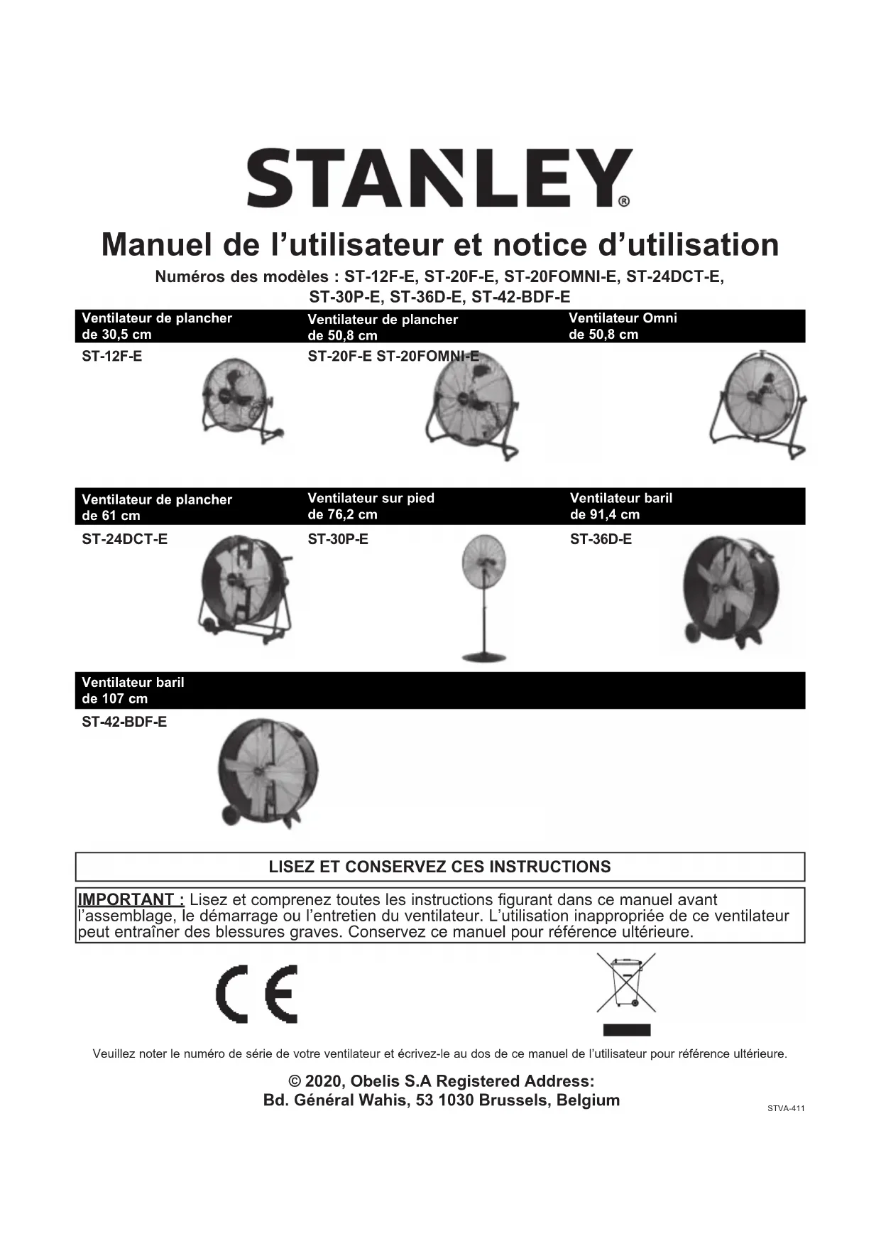 Manuel de l’utilisateur et notice d’utilisation Ventilateur de plancher de 50,8 cm Ventilateur Omni de 50,8 cm Ventilateur sur pied de 76,2 cm © 2020, Obelis S.A Registered Address: Bd. Général Wahis, 53 1030 Brussels, Belgium Ventilateur de plancher de 61 cm Ventilateur baril de 91,4 cm STVA-411 ST-12F-E