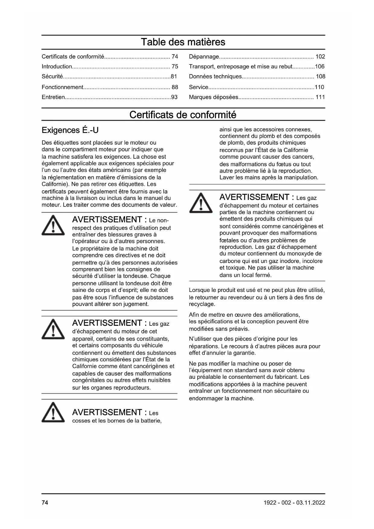 d’échappement du moteur et certaines parties de la machine contiennent ou émettent des produits chimiques qui sont considérés comme cancérigènes et pouvant provoquer des malformations fœtales ou d’autres problèmes de reproduction. Les gaz d’échappement du moteur contiennent du monoxyde de carbone qui est un gaz inodore, incolore et toxique. Ne pas utiliser la machine dans un local fermé. Lorsque le produit est usé et ne peut plus être utilisé, le retourner au revendeur ou à un tiers à des fins de recyclage. Afin de mettre en œuvre des améliorations, les spécifications et la conception peuvent être modifiées sans préavis. N’utiliser que des pièces d’origine pour les réparations. Le recours à d’autres pièces aura pour effet d’annuler la garantie. Ne pas modifier la machine ou poser de l’équipement non standard sans avoir obtenu au préalable le consentement du fabricant. Les modifications apportées à la machine peuvent entraîner un fonctionnement non sécuritaire ou endommager la machine.
