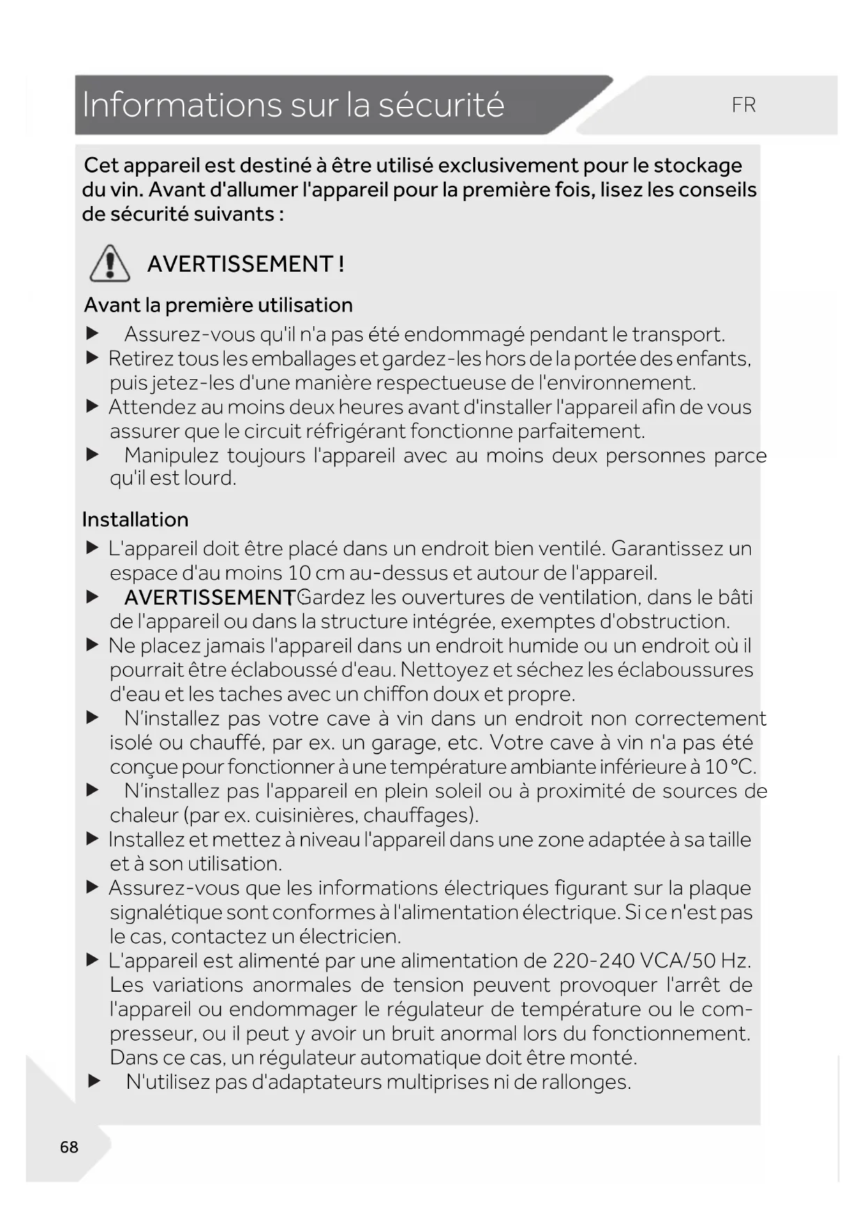 1-Informations sur la s écurité Ìè÷äóóäõèìïèö÷çèö÷ìñƀƘƸ÷õèø÷ìïìöƀèûæïøöìùèðèñ÷óòøõïèö÷òæîäêè çøùìñÊùäñ÷çäïïøðèõïäóóäõèìïóòøõïäóõèðìƙõèéòìöïìöèýïèöæòñöèìïö çèöƀæøõì÷ƀöøìùäñ÷ö ÊßÎÛÝÒÜÜÎÖÎ×Ý Êùäñ÷ïäóõèðìƙõèø÷ìïìöä÷ìòñ f Assurez-vous qu'il n'a pas été endommagé pendant le transport. f Retirez tous les emballages et gardez-les hors de la portée des enfants, puis jetez-les d'une manière respectueuse de l'environnement. f Attendez au moins deux heures avant d'installer l'appareil afin de vous assurer que le circuit réfrigérant fonctionne parfaitement. f Manipulez toujours l'appareil avec au moins deux personnes parce qu'il est lourd. Òñö÷äïïä÷ìòñ f L'appareil doit être placé dans un endroit bien ventilé. Garantissez un espace d'au moins 10 cm au-dessus et autour de l'appareil. f ÊßÎÛÝÒÜÜÎÖÎ×Ý: Gardez les ouvertures de ventilation, dans le bâti de l'appareil ou dans la structure intégrée, exemptes d'obstruction. f Ne placez jamais l'appareil dans un endroit humide ou un endroit où il pourrait être éclaboussé d'eau. Nettoyez et séchez les éclaboussures d'eau et les taches avec un chiffon doux et propre. f N’installez pas votre cave à vin dans un endroit non correctement isolé ou chauffé, par ex. un garage, etc. Votre cave à vin n'a pas été conçue pour fonctionner à une température ambiante inférieure à 10 °C. f N’installez pas l'appareil en plein soleil ou à proximité de sources de chaleur (par ex. cuisinières, chauffages). f Installez et mettez à niveau l'appareil dans une zone adaptée à sa taille et à son utilisation. f Assurez-vous que les informations électriques figurant sur la plaque signalétique sont conformes à l'alimentation électrique. Si ce n'est pas le cas, contactez un électricien. f L'appareil est alimenté par une alimentation de 220-240 VCA/50 Hz. Les variations anormales de tension peuvent provoquer l'arrêt de l'appareil ou endommager le régulateur de température ou le com- presseur, ou il peut y avoir un bruit anormal lors du fonctionnement. Dans ce cas, un régulateur automatique doit être monté. f N'utilisez pas d'adaptateurs multiprises ni de rallonges.FR Informations sur la sécurité