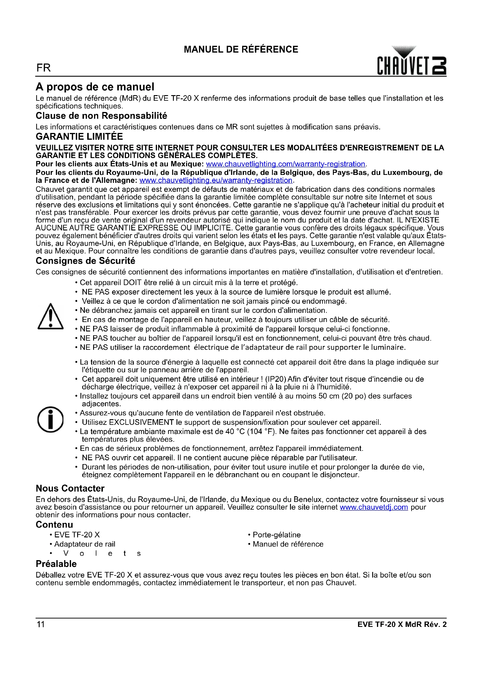 au Mexique. Pour connaître les conditions de garantie dans d'autres pays, veuillez consulter votre revendeur local. Consignes de Sécurité Ces consignes de sécurité contiennent des informations importantes en matière d'installation, d'utilisation et d'entretien. Nous Contacter En dehors des États-Unis, du Royaume-Uni, de l'Irlande, du Mexique ou du Benelux, contactez votre fournisseur si vous avez besoin d'assistance ou pour retourner un appareil. Veuillez consulter le site internet www.chauvetdj.com pour obtenir des informations pour nous contacter. Contenu Préalable Déballez votre EVE TF-20 X et assurez-vous que vous avez reçu toutes les pièces en bon état. Si la boîte et/ou son contenu semble endommagés, contactez immédiatement le transporteur, et non pas Chauvet.