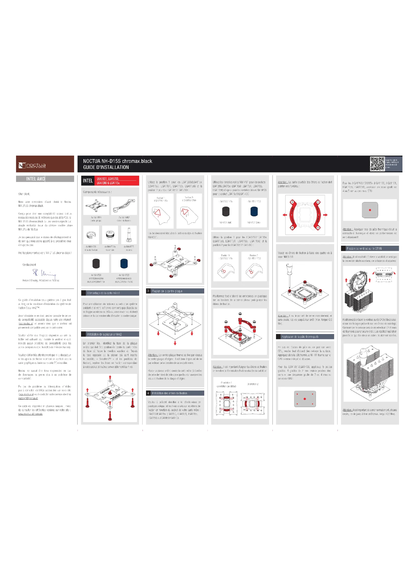 » et les positions de xation), repérez les trous de xation correspondant à votre socket et insérez convenablement les 4 vis. INTEL Transporting your system Fixation du ventirad sur le CPU6 Attention : il est important de serrer normalement, et sans excès, les vis jusqu’à leur arrêt (max. torque 0,6 Nm). Positionnez à présent le ventirad sur le CPU et xez celui- ci sur les letages présents sur les étriers de montage. Commencez le serrage des vis en effectuant 2-3 tours de tournevis pour chacune d’elle puis répétez l’opération jusqu’à ce que les deux vis soient totalement serrées. Attention : Appliquer trop de pâte thermique réduit la conductivité thermique et donc les performances de refroidissement! Pour les LGA1200/LGA115x (LGA1150, LGA1151, LGA1155, LGA1156), appliquez une seule goutte de 4 ou 5 mm au centre du CPU : Attention : il est impératif d’enlever le ventilateur ainsi que la protection située au niveau de la base du dissipateur. Cher client, Nous vous remercions d’avoir choisi le Noctua NH-D15S chromax.black. Conçu pour offrir une comptabilité accrue tant au niveau des modules de mémoire que des slots PCIe, le NH-D15S chromax.black est une version asymétrique simple ventilation issue du célèbre modèle phare NH-D15 de Noctua. Je suis persuadé que le niveau de développement et de soin que nous avons apporté à ce produit ne vous échappera pas. Protez pleinement de votre NH-D15S chromax.black ! Cordialement, Roland Mossig, Président de Noctua Fixation de la contre-plaque