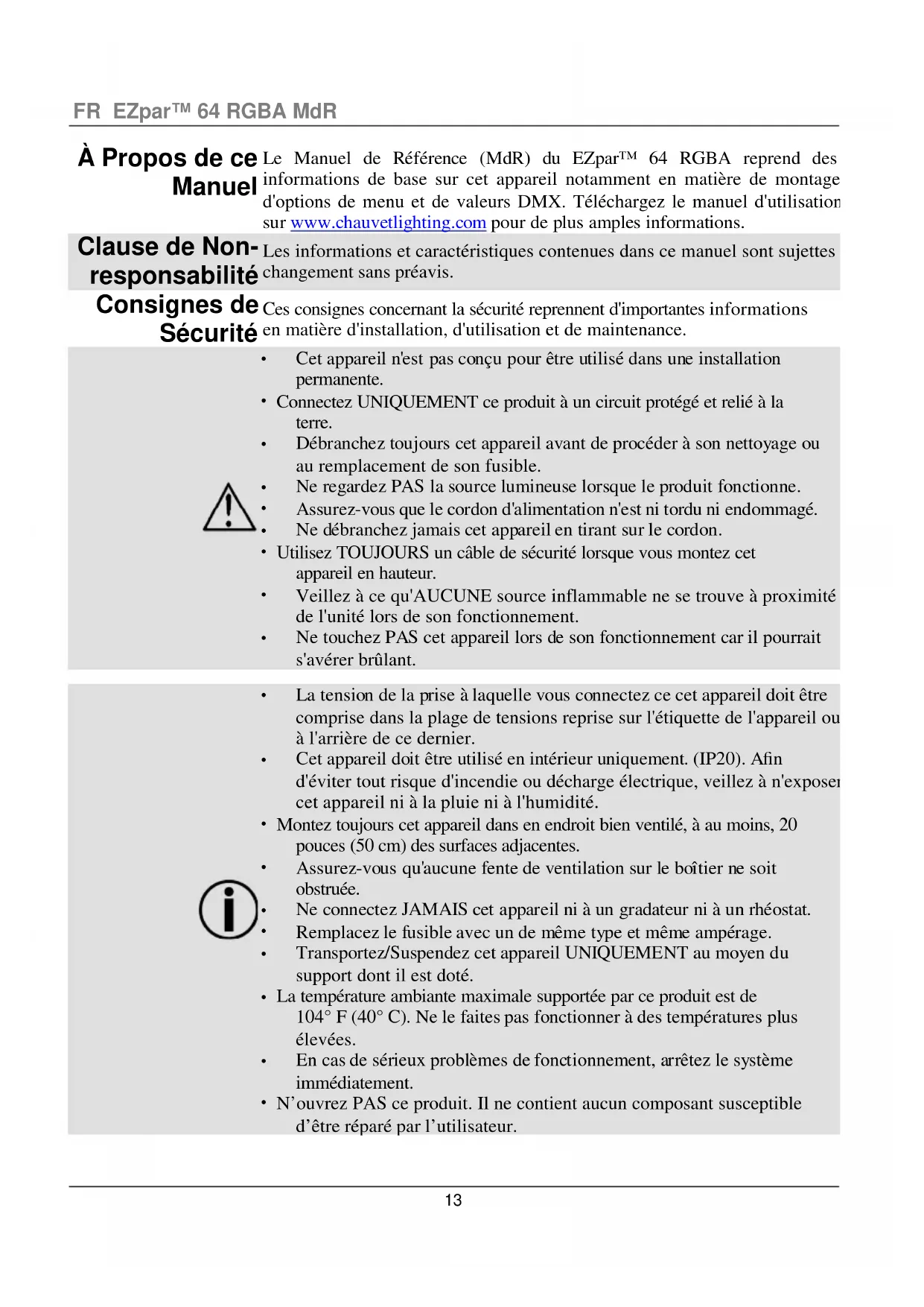 anuel Le Manuel de Référence (MdR) du EZpar™ 64 RGBA reprend des informations de base sur cet appareil notamment en matière de montage, d'options de menu et de valeurs DMX. Téléchargez le manuel d'utilisation sur www.chauvetlighting.com pour de plus amples informations. Clause de Non- responsabilité Les informations et caractéristiques contenues dans ce manuel sont sujettes à changement sans préavis. Consignes de Sécurité