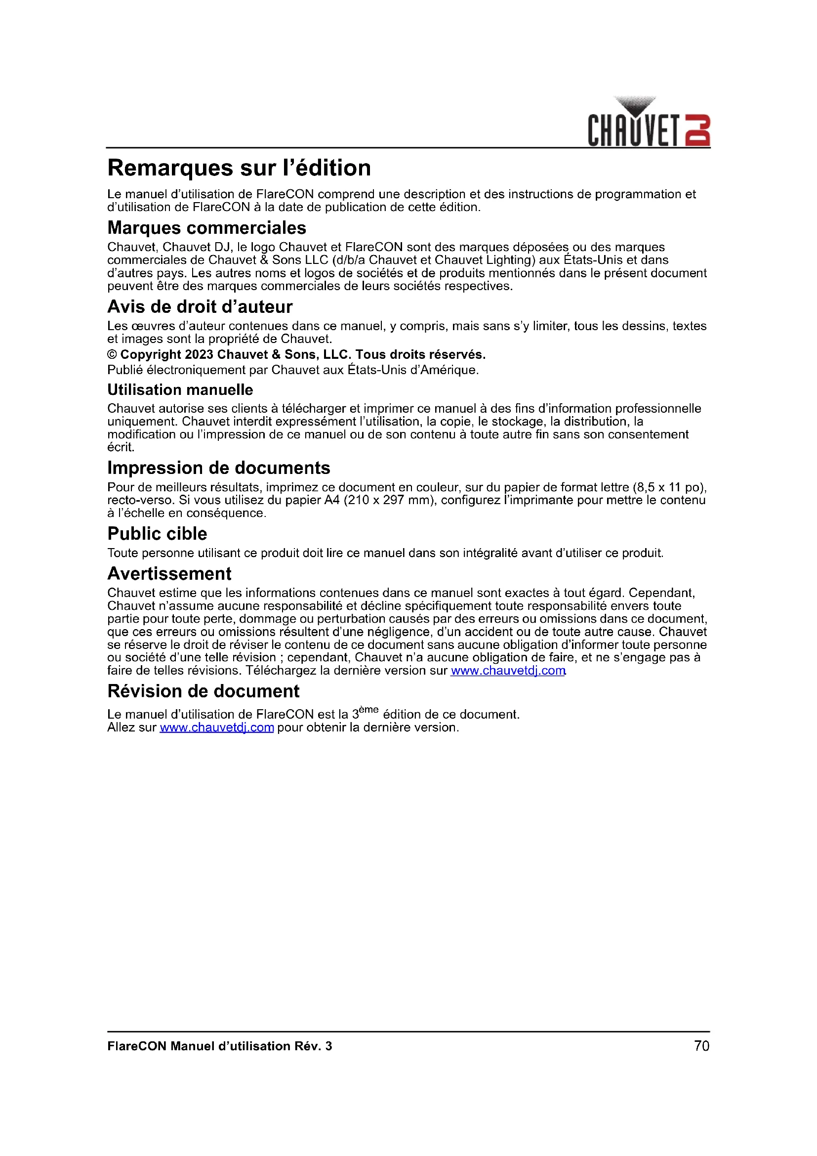 Remarques sur l’édition Le manuel d’utilisation de FlareCON comprend une description et des instructions de programmation et d’utilisation de FlareCON à la date de publication de cette édition. Marques commerciales Chauvet, Chauvet DJ, le logo Chauvet et FlareCON sont des marques déposées ou des marques commerciales de Chauvet & Sons LLC (d/b/a Chauvet et Chauvet Lighting) aux États-Unis et dans d’autres pays. Les autres noms et logos de sociétés et de produits mentionnés dans le présent document peuvent être des marques commerciales de leurs sociétés respectives. Avis de droit d’auteur Les œuvres d’auteur contenues dans ce manuel, y compris, mais sans s’y limiter, tous les dessins, textes et images sont la propriété de Chauvet. © Copyright 2023 Chauvet & Sons, LLC. Tous droits réservés. Publié électroniquement par Chauvet aux États-Unis d’Amérique. Utilisation manuelle Chauvet autorise ses clients à télécharger et imprimer ce manuel à des fins d’information professionnelle uniquement. Chauvet interdit expressément l’utilisation, la copie, le stockage, la distribution, la modification ou l’impression de ce manuel ou de son contenu à toute autre fin sans son consentement écrit. Impression de documents Pour de meilleurs résultats, imprimez ce document en couleur, sur du papier de format lettre (8,5 x 11 po), recto-verso. Si vous utilisez du papier A4 (210 x 297 mm), configurez l’imprimante pour mettre le contenu à l’échelle en conséquence. Public cible Toute personne utilisant ce produit doit lire ce manuel dans son intégralité avant d’utiliser ce produit