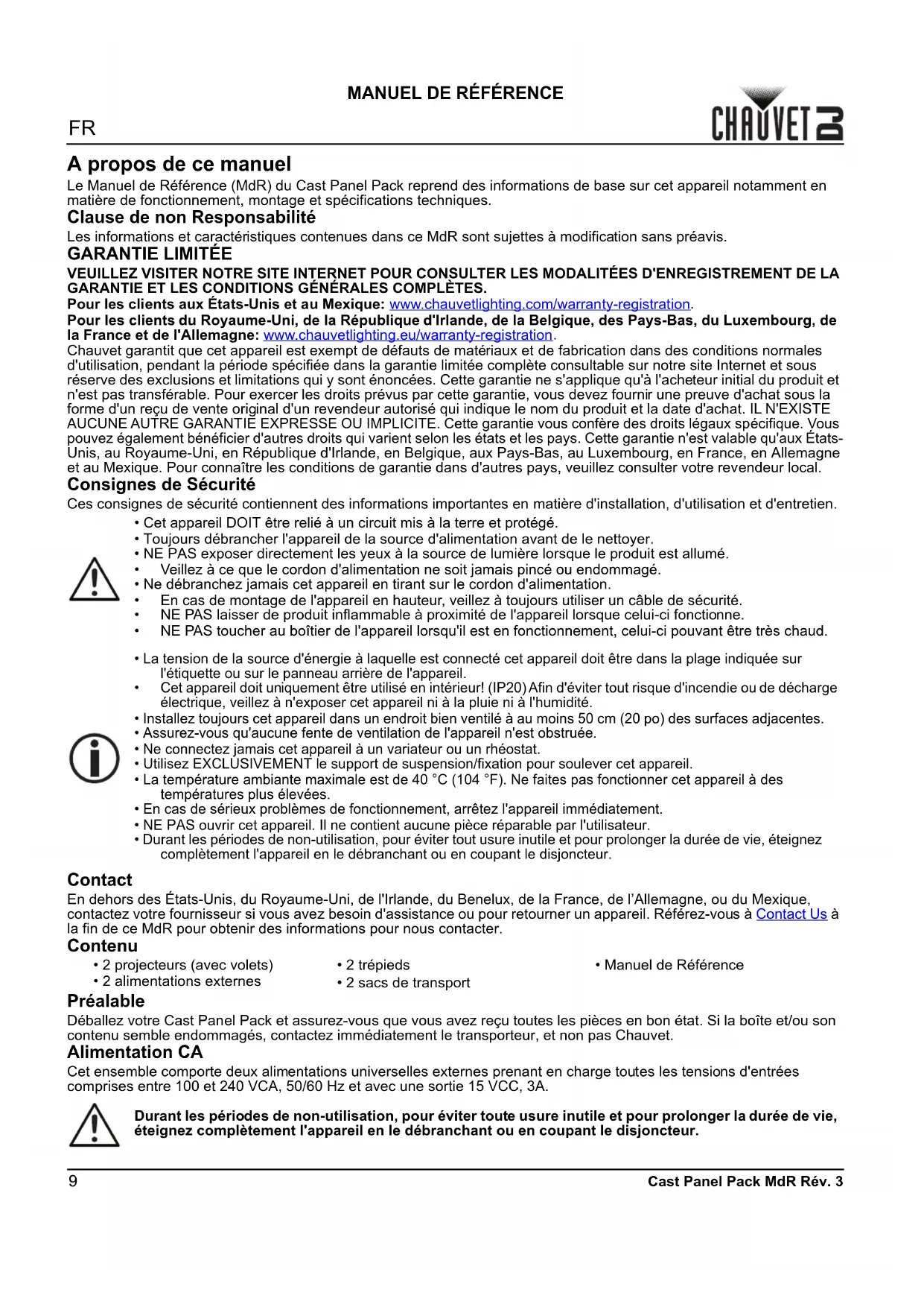 la fin de ce MdR pour obtenir des informations pour nous contacter. Contenu Préalable Déballez votre Cast Panel Pack et assurez-vous que vous avez reçu toutes les pièces en bon état. Si la boîte et/ou son contenu semble endommagés, contactez immédiatement le transporteur, et non pas Chauvet. Alimentation CA Cet ensemble comporte deux alimentations universelles externes prenant en charge toutes les tensions d'entrées comprises entre 100 et 240 VCA, 50/60 Hz et avec une sortie 15 VCC, 3A.
