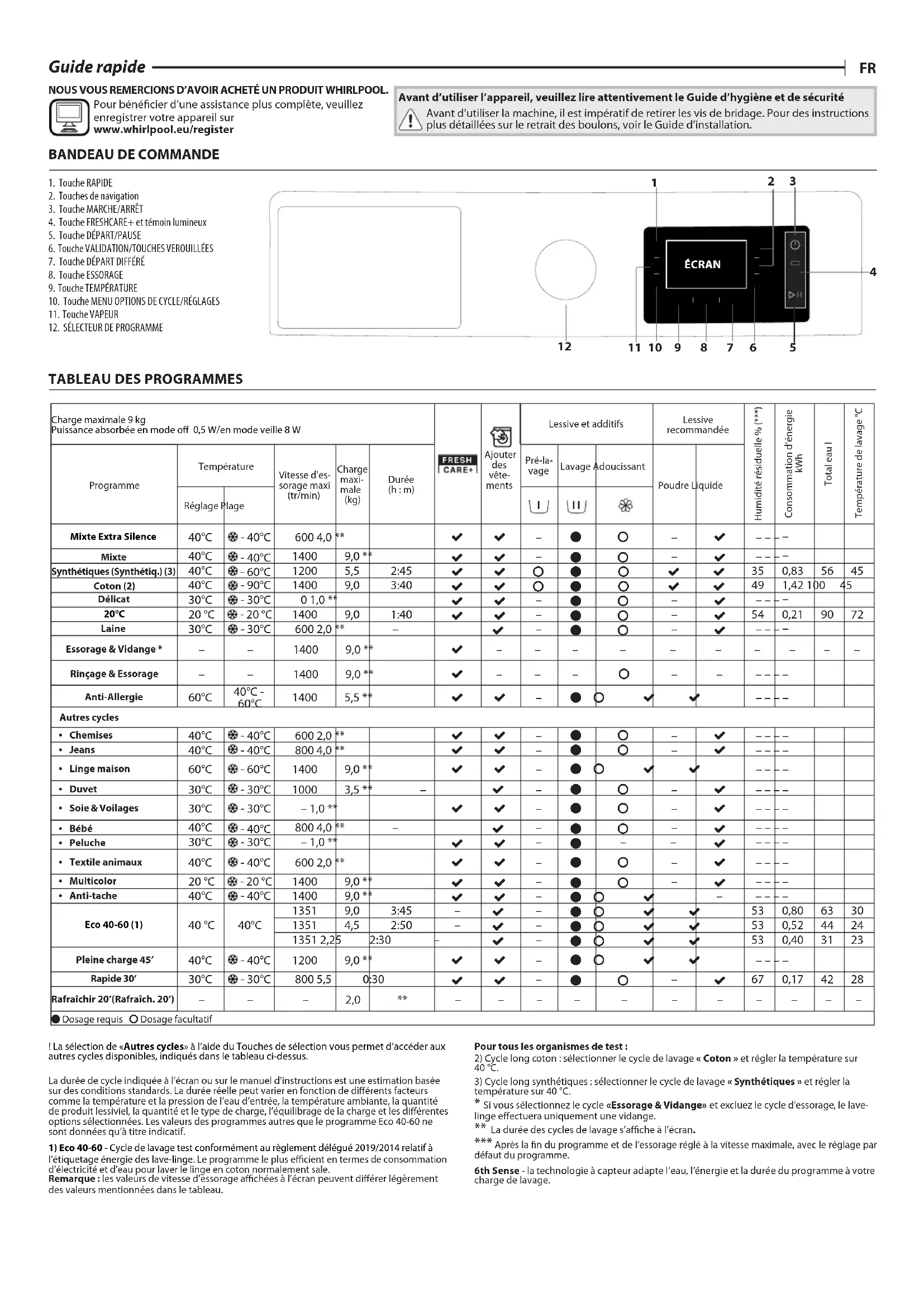 ÉCRANCharge maximale 9kgPuissance absorbée en mode o 0,5 W/en mode veille 8 WAjouter des vête-mentsLessive et additifsLessive recommandéeHumidité résiduelle % (***)Consommation d’énergie kWh Total eau ITempérature de lavage °CProgrammeTempératureVitesse d'es-sorage maxi (tr/min)Charge maxi-male (kg) Durée (h : m)Pré-la- vage Lavage AdoucissantPoudre LiquideRéglage Plage Mixte Extra Silence 40°C - 40°C 600 4,0 **