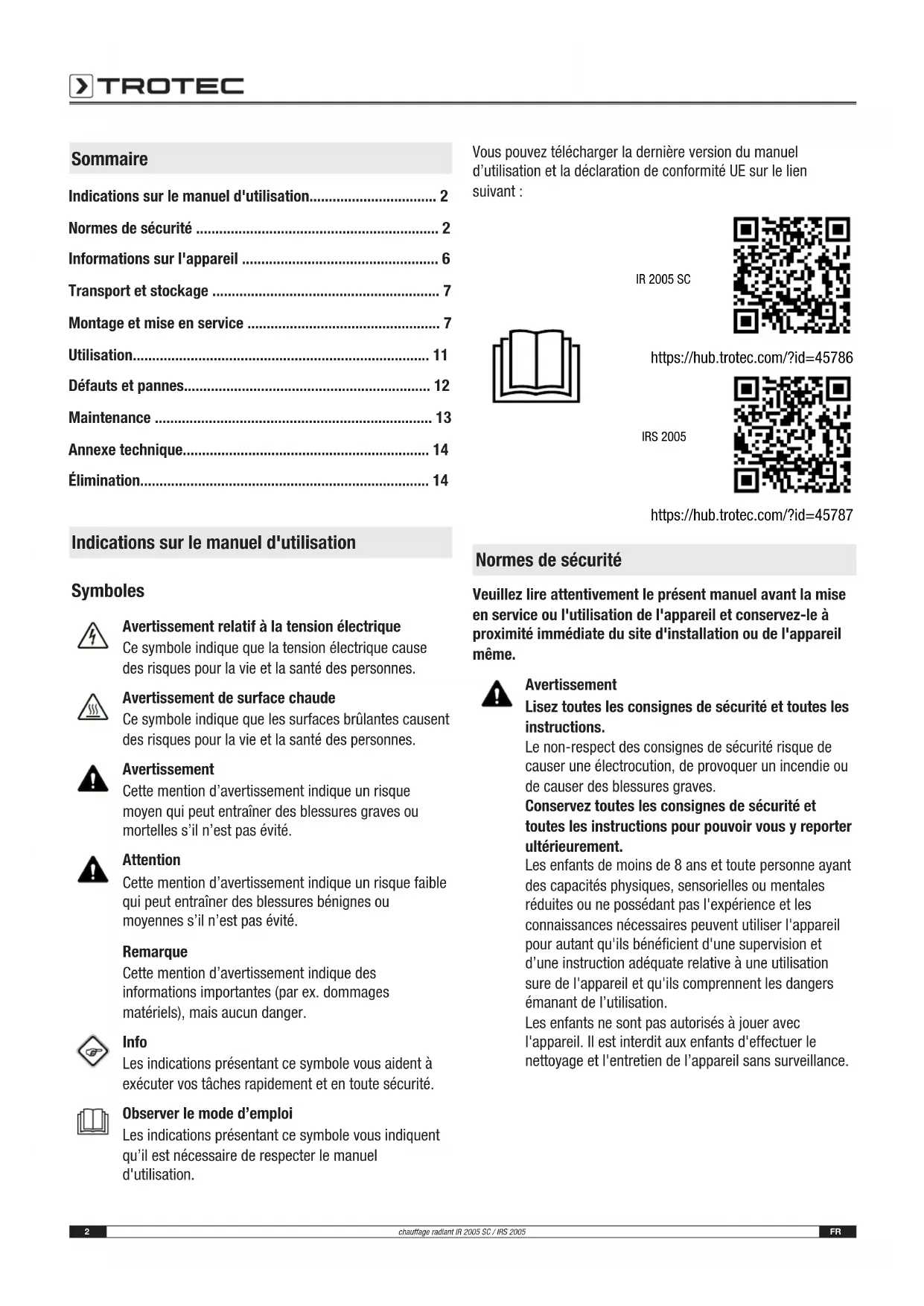 - Élimination Indications sur le manuel d'utilisation Symboles Avertissement relatif à la tension électrique Ce symbole indique que la tension électrique cause des risques pour la vie et la santé des personnes. Avertissement de surface chaude Ce symbole indique que les surfaces brûlantes causent des risques pour la vie et la santé des personnes. Avertissement Cette mention d’avertissement indique un risque moyen qui peut entraîner des blessures graves ou mortelles s’il n’est pas évité. Attention Cette mention d’avertissement indique un risque faible qui peut entraîner des blessures bénignes ou moyennes s’il n’est pas évité. Remarque Cette mention d’avertissement indique des informations importantes (par ex. dommages matériels), mais aucun danger. Info Les indications présentant ce symbole vous aident à exécuter vos tâches rapidement et en toute sécurité. Observer le mode d’emploi Les indications présentant ce symbole vous indiquent qu’il est nécessaire de respecter le manuel d'utilisation. Vous pouvez télécharger la dernière version du manuel d’utilisation et la déclaration de conformité UE sur le lien suivant: IR 2005 SC https://hub.trotec.com/?id=45786 IRS 2005 https://hub.trotec.com/?id=45787 Normes de sécurité Veuillez lire attentivement le présent manuel avant la mise en service ou l'utilisation de l'appareil et conservez-le à proximité immédiate du site d'installation ou de l'appareil même. Avertissement Lisez toutes les consignes de sécurité et toutes les instructions. Le non-respect des consignes de sécurité risque de causer une électrocution, de provoquer un incendie ou de causer des blessures graves. Conservez toutes les consignes de sécurité et toutes les instructions pour pouvoir vous y reporter ultérieurement. Les enfants de moins de 8 ans et toute personne ayant des capacités physiques, sensorielles ou mentales réduites ou ne possédant pas l'expérience et les connaissances nécessaires peuvent utiliser l'appareil pour autant qu'ils bénéficient d'une supervision et d’une instruction adéquate relative à une utilisation sure de l'appareil et qu'ils comprennent les dangers émanant de l’utilisation. Les enfants ne sont pas autorisés à jouer avec l'appareil. Il est interdit aux enfants d'effectuer le nettoyage et l'entretien de l’appareil sans surveillance.FR 3 chauffage radiant IR 2005 SC / IRS 2005 Avertissement Les enfants de moins de 3ans doivent être tenus à l'écart de l'appareil, sauf s’ils sont l’objet d’une surveillance constante. Les enfants âgés de 3 à 8ans n’ont le droit d’allumer et d’éteindre l’appareil que s’ils font l’objet d’une surveillance ou s’ils ont reçu une instruction adéquate relative à une utilisation sure de l'appareil et qu'ils ont compris les dangers liés à cette utilisation, à condition que l’appareil soit placé ou installé dans sa position normale d’utilisation. Les enfants âgés de 3 à 8ans n’ont pas le droit de brancher la fiche secteur dans la prise, de réguler l’appareil, de le nettoyer ni d’effectuer l’entretien utilisateur. Avertissement N’utilisez pas l’appareil dans des pièces de taille réduite s’il s’y trouve des personnes incapables de quitter la pièce de manière autonome et qu’elles ne sont pas sous surveillance permanente. p. 14