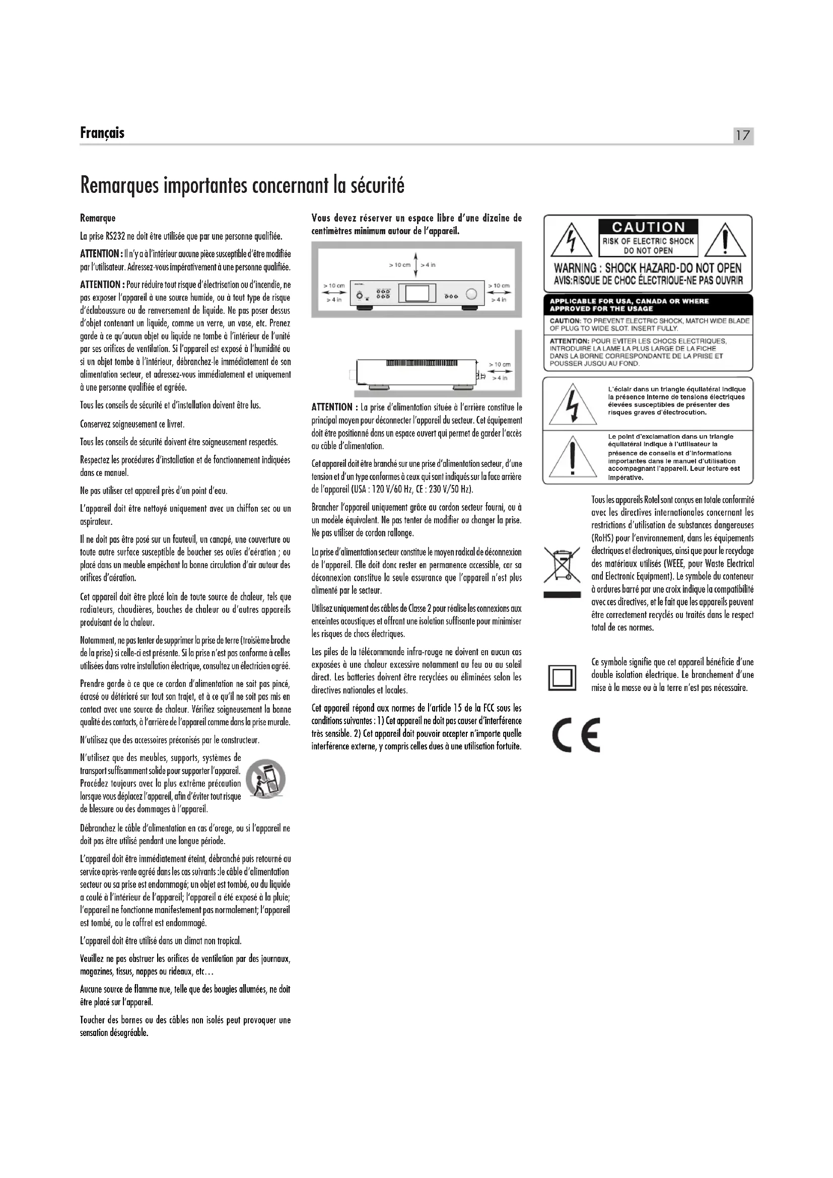 - /8”. WeightWeight (net) 9.15 kg, 20.17 lbs. All specications are accurate at the time of printing. Rotel reserves the right to make improvements without notice. Rotel and the Rotel HiFi logo are registered trademarks of The Rotel Co., Ltd. Tokyo, Japan. “Made for iPod,” and “Made for iPhone,” means that an electronic accessory has been designed to connect specically to iPod or iPhone, respectively, and has been certied by the developer to meet Apple performance standards. Apple is not responsible for the operation of this device or its compliance with safety and regulatory standards. Please note that the use of this accessory with iPod, or iPhone may affect wireless performance. iPhone, iPod, iPod classic, iPod nano, and iPod touch are trademarks of Apple Inc., registered in the U.S. and other countries. Use of the Works with Apple badge means that an accessory has been designed to work specically with the technology identied in the badge and has been certied by the developer to meet Apple performance standards. To control this AirPlay 2–enabled speaker, iOS 11.4 or later is required. Apple, AirPlay, Apple TV, Apple Watch, iPad, iPad Air, iPad Pro, iPhone, and Lightning are trademarks of Apple Inc., registered in the U.S. and other countries. ‘MQA’ or ‘MQA Studio’ indicates that the product is decoding and playing an MQA stream or le, and denotes provenance to ensure that the sound is identical to that of the source material. ‘MQA Studio’ indicates it is playing an MQA Studio le, which has either been approved in the studio by the artist/producer or has been veried by the copyright owner. ‘OFS’ conrms that the product is receiving an MQA stream or le. This delivers the nal unfold of the MQA le and displays the original sample rate.17 Français Vous devez réserver un espace libre d’une dizaine de centimètres minimum autour de l’appareil. ATTENTION : La prise d’alimentation située à l’arrière constitue le principal moyen pour déconnecter l’appareil du secteur. Cet équipement doit être positionné dans un espace ouvert qui permet de garder l‘accès au câble d’alimentation. Cet appareil doit être branché sur une prise d’alimentation secteur, d’une tension et d’un type conformes à ceux qui sont indiqués sur la face arrière de l’appareil (USA : 120 V/60 Hz, CE : 230 V/50 Hz). Brancher l’appareil uniquement grâce au cordon secteur fourni, ou à un modèle équivalent. Ne pas tenter de modifier ou changer la prise. Ne pas utiliser de cordon rallonge. La prise d’alimentation secteur constitue le moyen radical de déconnexion de l’appareil. Elle doit donc rester en permanence accessible, car sa déconnexion constitue la seule assurance que l’appareil n’est plus alimenté par le secteur. Utilisez uniquement des câbles de Classe 2 pour réalise les connexions aux enceintes acoustiques et offrant une isolation suffisante pour minimiser les risques de chocs électriques. Les piles de la télécommande infra-rouge ne doivent en aucun cas exposées à une chaleur excessive notamment au feu ou au soleil direct. Les batteries doivent être recyclées ou éliminées selon les directives nationales et locales. Cet appareil répond aux normes de l’article 15 de la FCC sous les conditions suivantes : 1) Cet appareil ne doit pas causer d’interférence très sensible. 2) Cet appareil doit pouvoir accepter n’importe quelle interférence externe, y compris celles dues à une utilisation fortuite. Remarque La prise RS232 ne doit être utilisée que par une personne qualifiée. ATTENTION : Il n’y a à l’intérieur aucune pièce susceptible d’être modifiée par l’utilisateur. Adressez-vous impérativement à une personne qualifiée. ATTENTION : Pour réduire tout risque d’électrisation ou d’incendie, ne pas exposer l’appareil à une source humide, ou à tout type de risque d’éclaboussure ou de renversement de liquide. Ne pas poser dessus d’objet contenant un liquide, comme un verre, un vase, etc. Prenez garde à ce qu’aucun objet ou liquide ne tombe à l’intérieur de l’unité par ses orifices de ventilation. Si l’appareil est exposé à l’humidité ou si un objet tombe à l’intérieur, débranchez-le immédiatement de son alimentation secteur, et adressez-vous immédiatement et uniquement à une personne qualifiée et agréée. Tous les conseils de sécurité et d’installation doivent être lus. Conservez soigneusement ce livret. Tous les conseils de sécurité doivent être soigneusement respectés. Respectez les procédures d’installation et de fonctionnement indiquées dans ce manuel. Ne pas utiliser cet appareil près d’un point d’eau. L’appareil doit être nettoyé uniquement avec un chiffon sec ou un aspirateur. Il ne doit pas être posé sur un fauteuil, un canapé, une couverture ou toute autre surface susceptible de boucher ses ouïes d’aération ; ou placé dans un meuble empêchant la bonne circulation d’air autour des orifices d’aération. Cet appareil doit être placé loin de toute source de chaleur, tels que radiateurs, chaudières, bouches de chaleur ou d’autres appareils produisant de la chaleur. Notamment, ne pas tenter de supprimer la prise de terre (troisième broche de la prise) si celle-ci est présente. Si la prise n’est pas conforme à celles utilisées dans votre installation électrique, consultez un électricien agréé. Prendre garde à ce que ce cordon d’alimentation ne soit pas pincé, écrasé ou détérioré sur tout son trajet, et à ce qu’il ne soit pas mis en contact avec une source de chaleur. Vérifiez soigneusement la bonne qualité des contacts, à l’arrière de l’appareil comme dans la prise murale. N’utilisez que des accessoires préconisés par le constructeur. N’utilisez que des meubles, supports, systèmes de transport suffisamment solide pour supporter l’appareil. Procédez toujours avec la plus extrême précaution lorsqu
