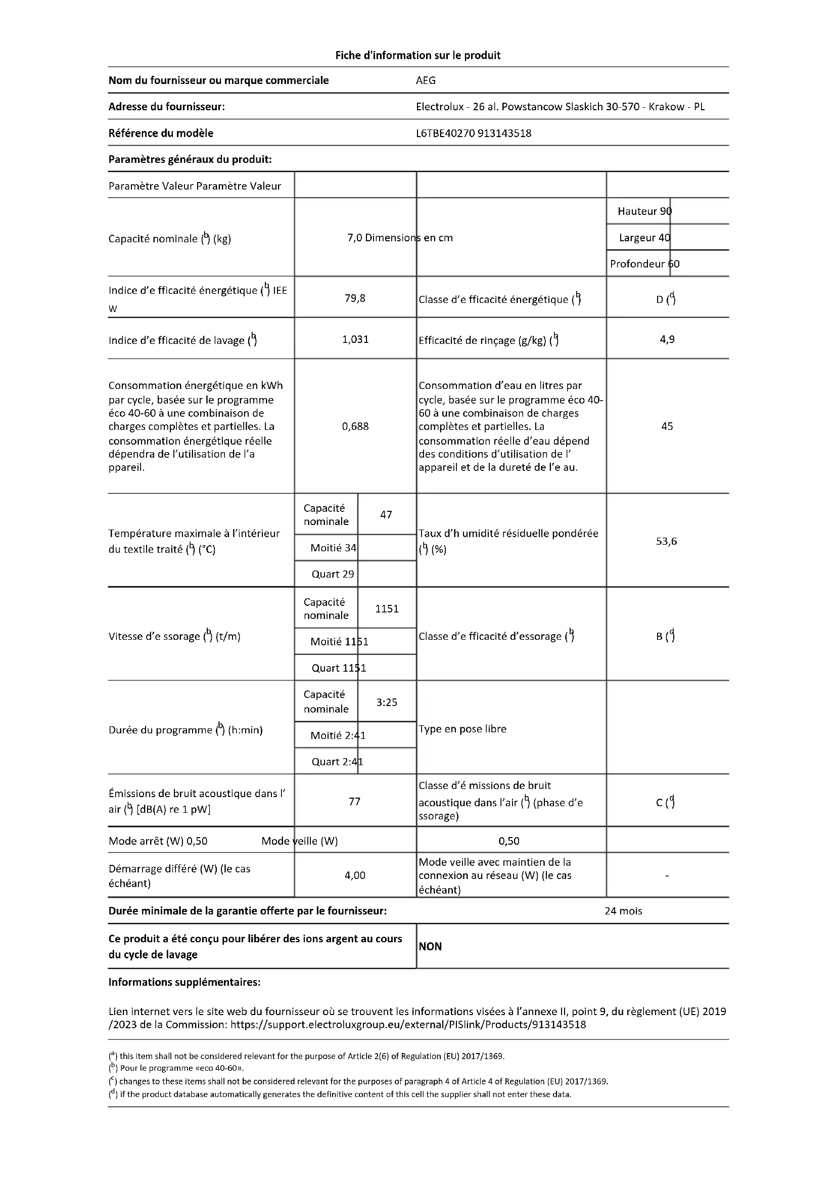 Durée minimale de la garantie offerte par le fournisseur: 24 mois Ce produit a été conçu pour libérer des ions argent au cours du cycle de lavage NON Informations supplémentaires: Lien internet vers le site web du fournisseur où se trouvent les informations visées à l’annexe II, point 9, du règlement (UE) 2019 /2023 de la Commission: https://support.electroluxgroup.eu/external/PISlink/Products/913143518 ( ) this item shall not be considered relevant for the purpose of Article 2(6) of Regulation (EU) 2017/1369.